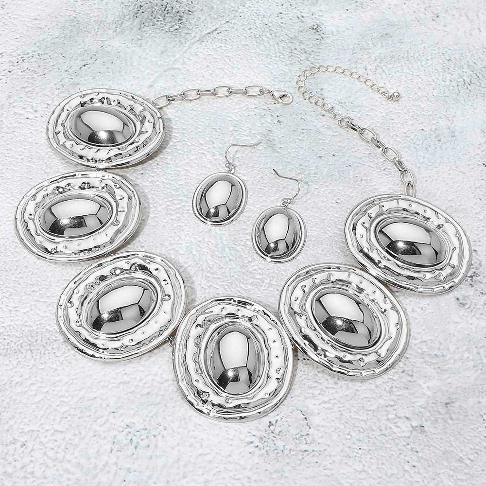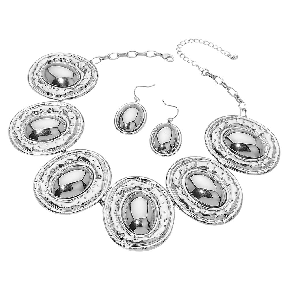 Details • Necklace Size : 16" + 3.25" L • Decor Size : 1.75" L • Earrings Size : 1.7" L • Bold statement necklace and matching earring set designed with layered oval medallion elements and a sculpted, dimensional profile. This coordinated jewelry set creates a strong focal point for elevated styling, special occasions, and boutique assortments, offering a balanced mix of modern structure and timeless statement appeal that pairs easily with both casual and dress-forward looks. • Lead and Nickel Compliant