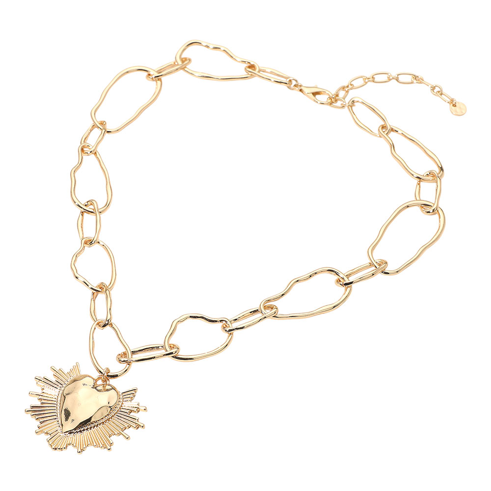 Details • Necklace Size : 21" + 3" L • Pendant Size : 2" X 1.75" • This radiant heart charm link necklace features an expressive chain silhouette accented with a bold heart focal and sunburst-inspired detailing. Designed to stand out while remaining easy to style, it adds statement appeal to everyday outfits, layered looks, and trend-forward collections, making it ideal for boutiques and gift-ready displays. • Lead and Nickel Compliant