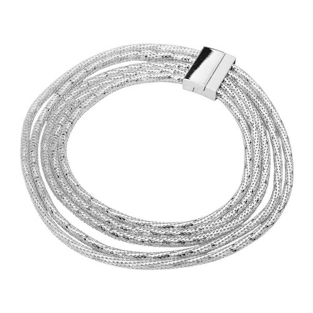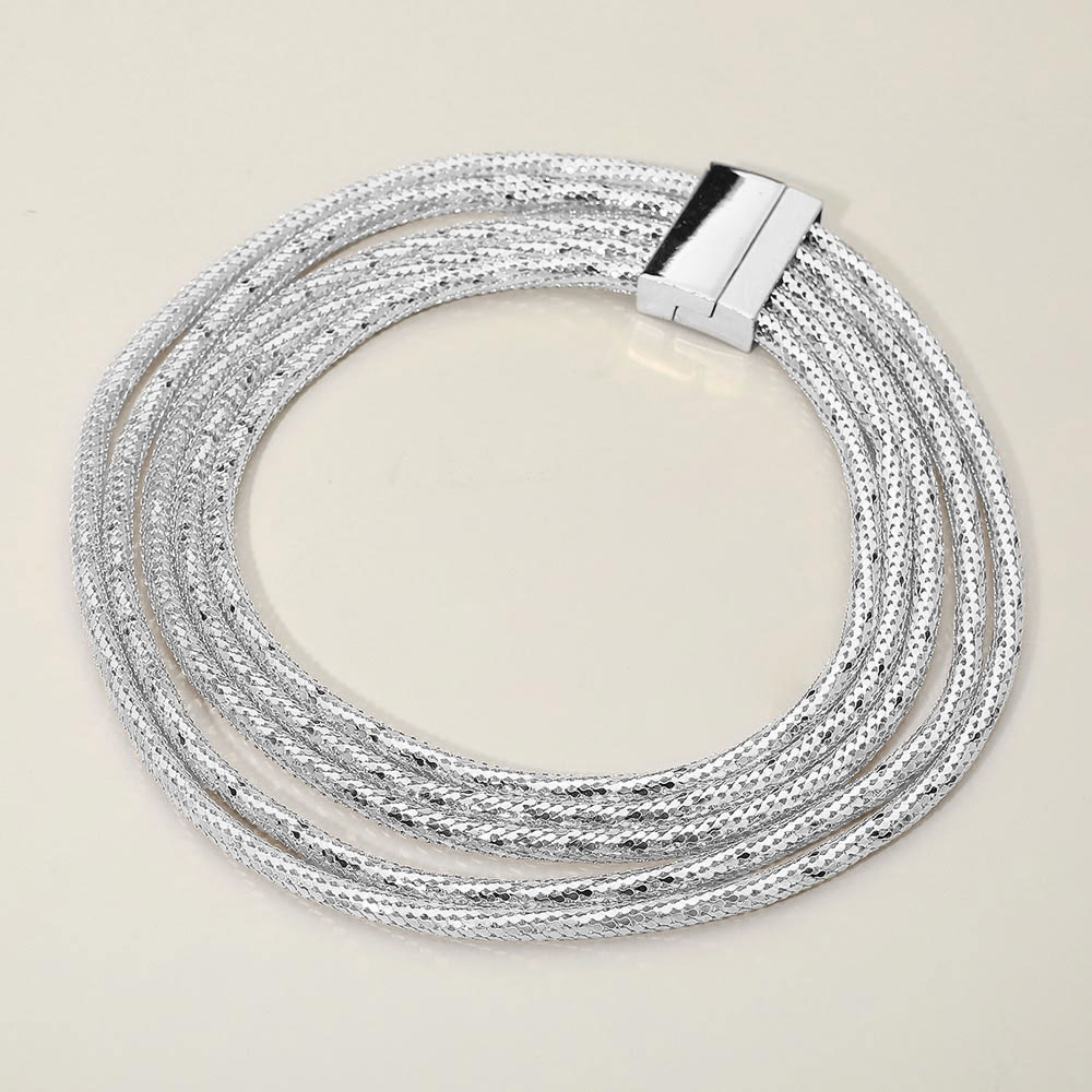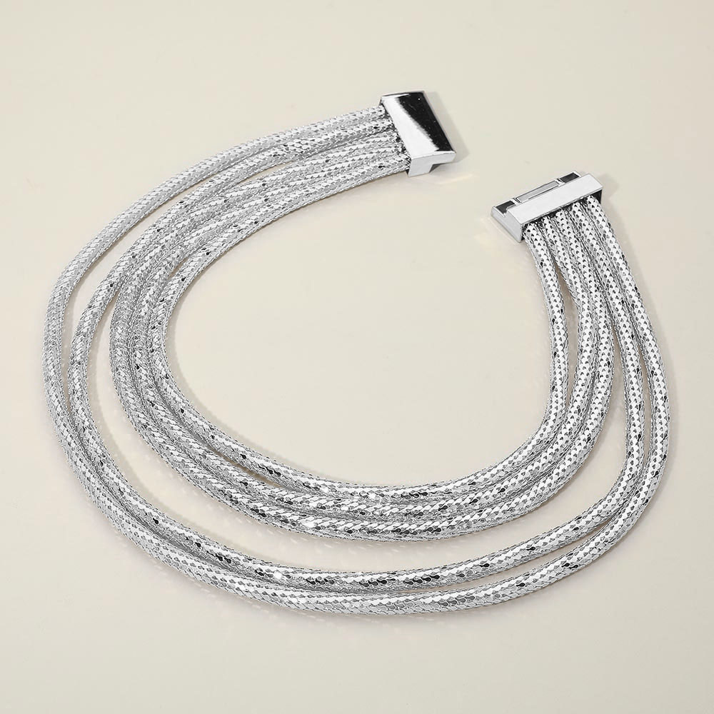• Layered multi-strand textured chain necklace featuring shimmering woven strands and a sleek magnetic clasp. A bold yet versatile statement piece perfect for elevating casual or dressy outfits with a modern, polished finish.