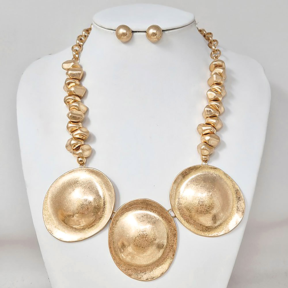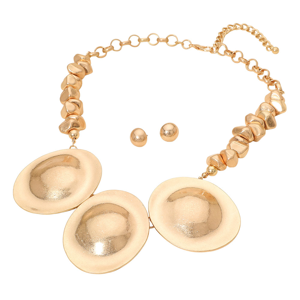 • Elevate your look with this striking necklace featuring sculpted disc accents paired with classic stud earrings. Designed for bold, artistic style, this set adds a dramatic touch to evening outfits, special events, or statement fashion moments, offering standout elegance with a modern, eye-catching finish.