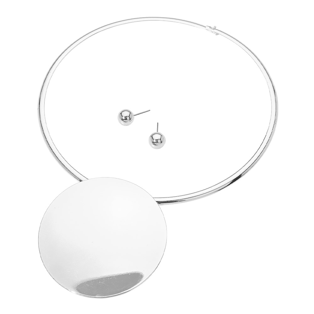 • Make a bold statement with this modern round pendant necklace and matching stud earring set. The sleek, minimalist design and polished finish create a striking contemporary look. Perfect for adding effortless sophistication and artistic flair to any outfit or occasion.