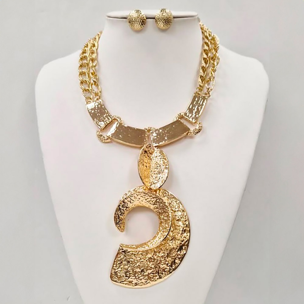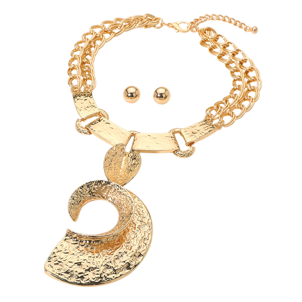 • This textured crescent statement necklace set combines bold design with refined artistry. The sculpted crescent pendant, paired with matching stud earrings, creates an eye-catching centerpiece that enhances both modern and elegant outfits with a touch of distinctive sophistication.