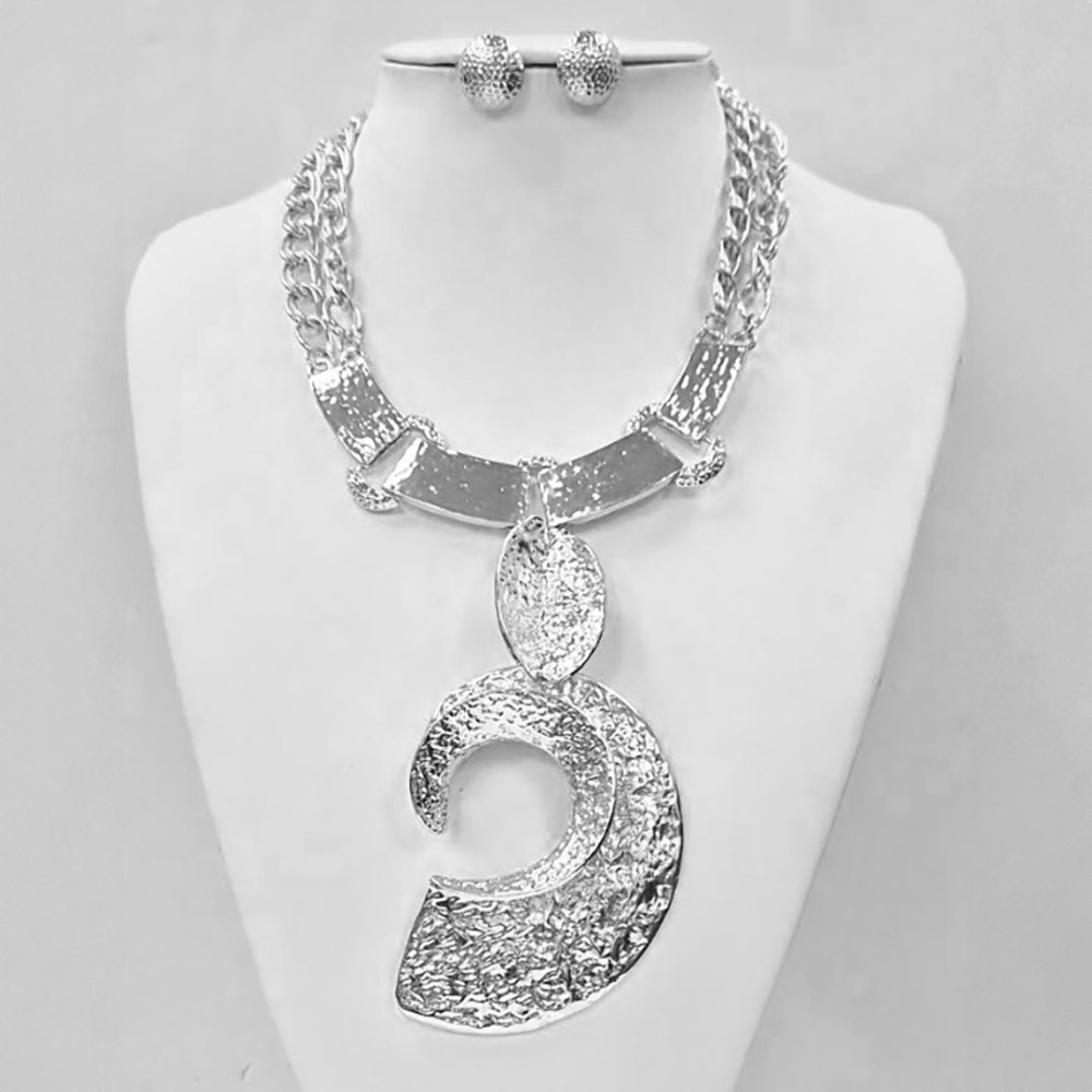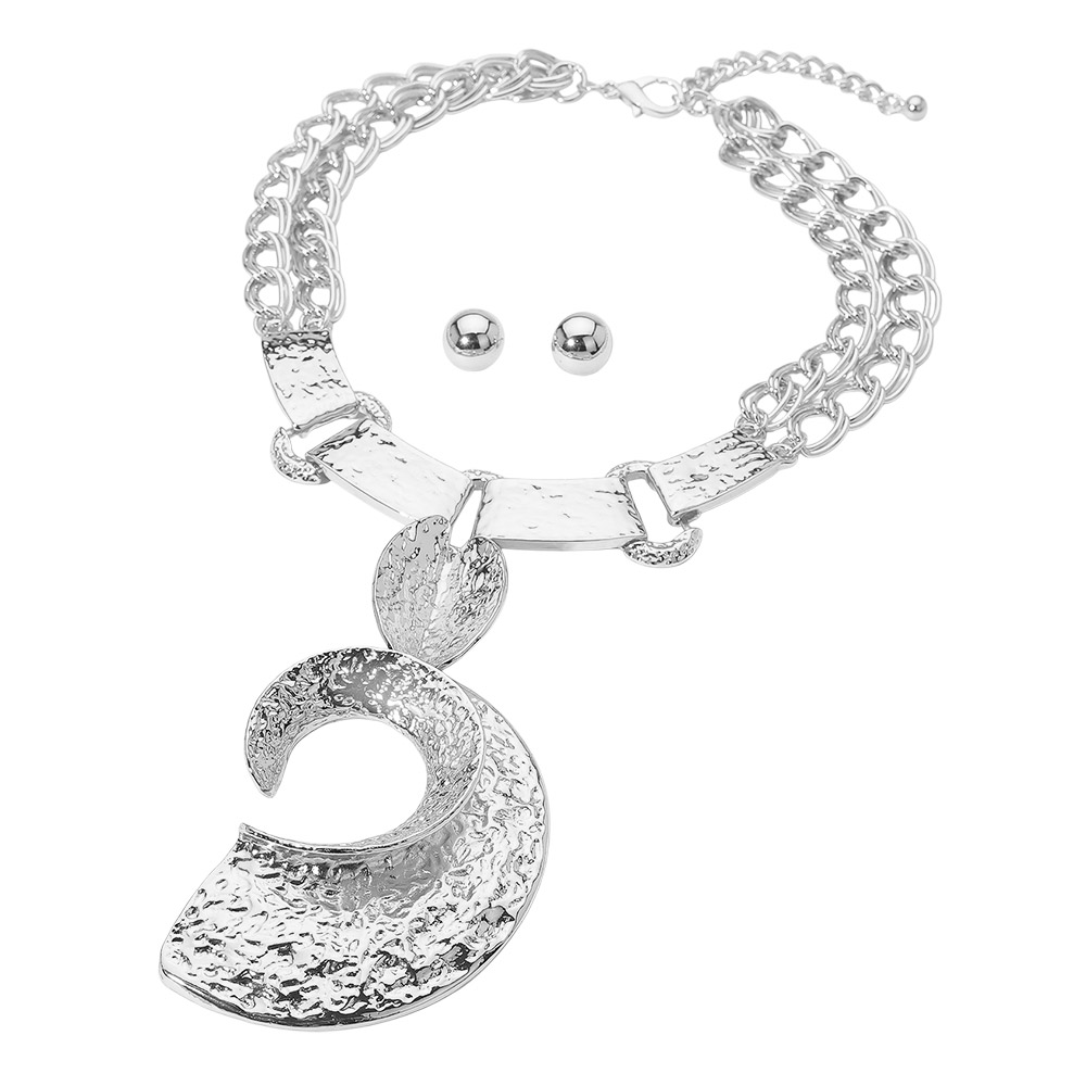 Details • Necklace Size : 17" + 3" L • Decor Size : 5.75" L • Earrings Size : 0.5" L • This textured crescent statement necklace set combines bold design with refined artistry. The sculpted crescent pendant, paired with matching stud earrings, creates an eye-catching centerpiece that enhances both modern and elegant outfits with a touch of distinctive sophistication. • Lead and Nickel Compliant