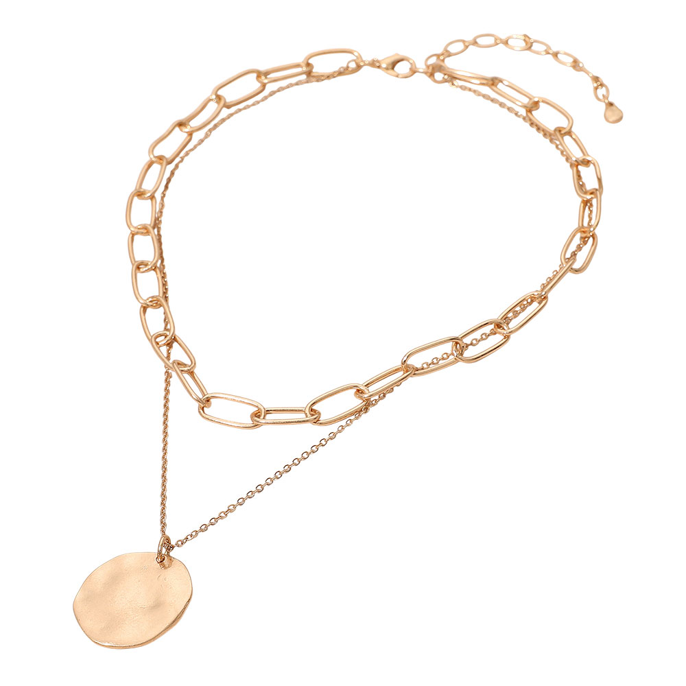 Brushed Hammered Metal Round Pendant Paperclip Chain Layered Necklace