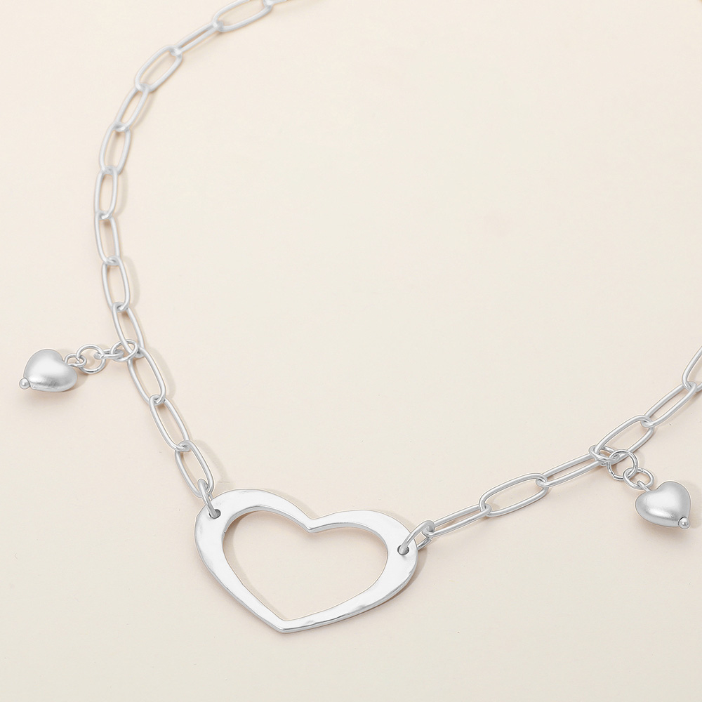 Brushed Metal Open Heart Pendant Bead Charm Paperclip Chain Necklace