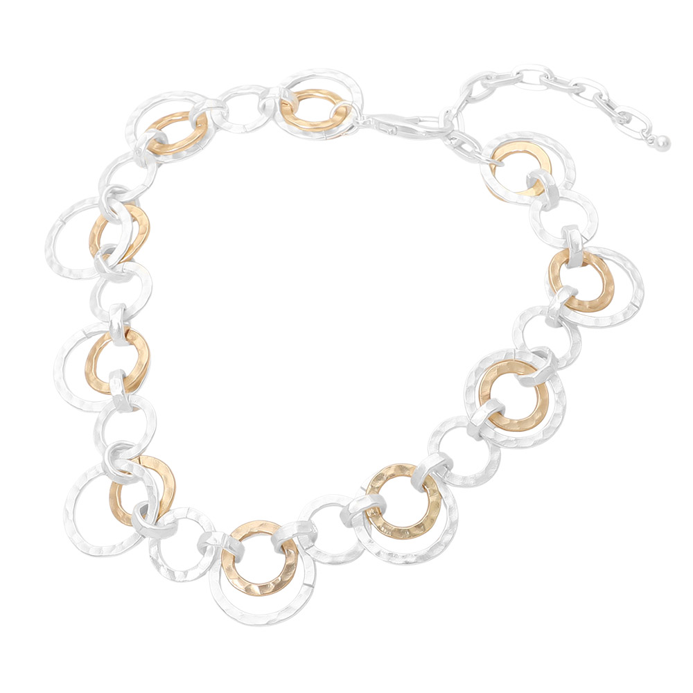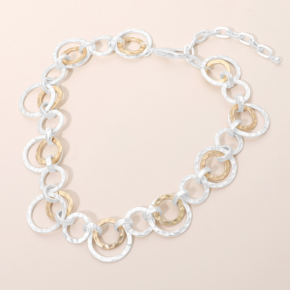 Details • Necklace Size : 14.5" + 2.5" L • Decor Size : 0.9" L • Bold mixed link statement necklace featuring an eye-catching circular chain design that adds modern dimension to any outfit. Designed for effortless styling, this necklace works beautifully for everyday wear or elevated looks, making it a versatile choice for boutiques seeking trend-forward yet timeless accessories. • Lead and Nickel Compliant