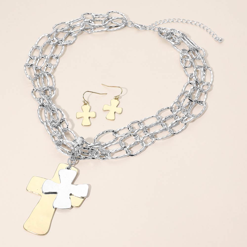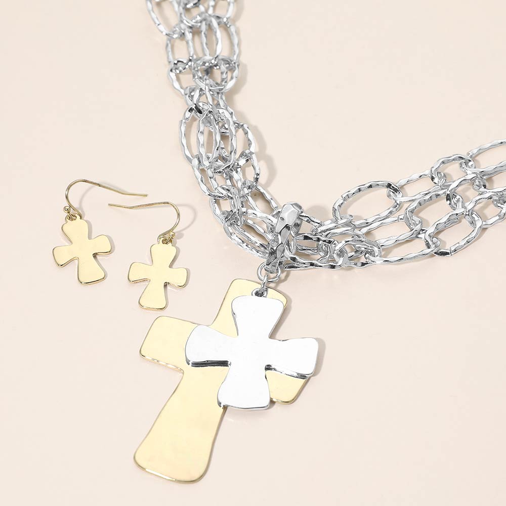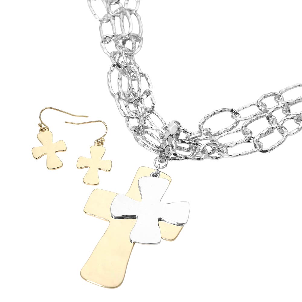 • This layered cross pendant necklace set features a bold cross charm paired with textured multi-link chains and matching drop earrings for a coordinated look. The dimensional design creates visual impact while remaining easy to style for everyday wear or meaningful gifting. A versatile jewelry set ideal for boutiques seeking symbolic pieces that blend modern layering with timeless appeal.