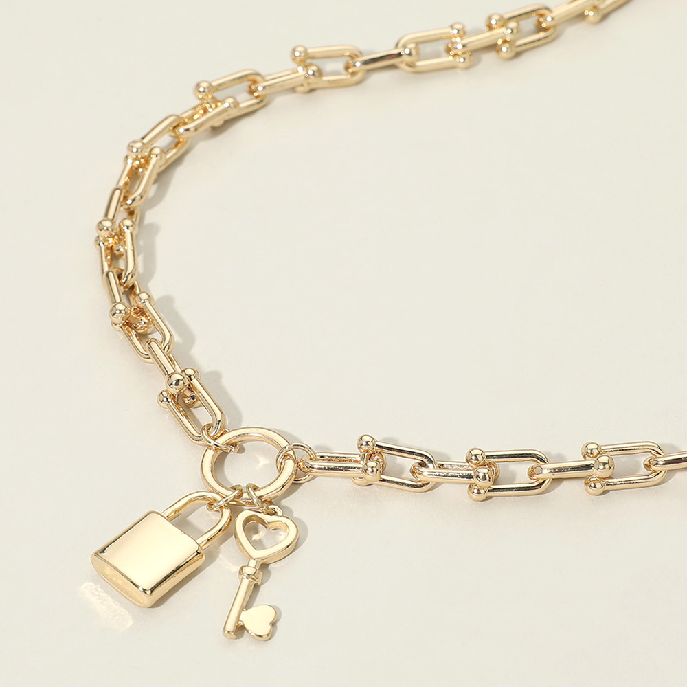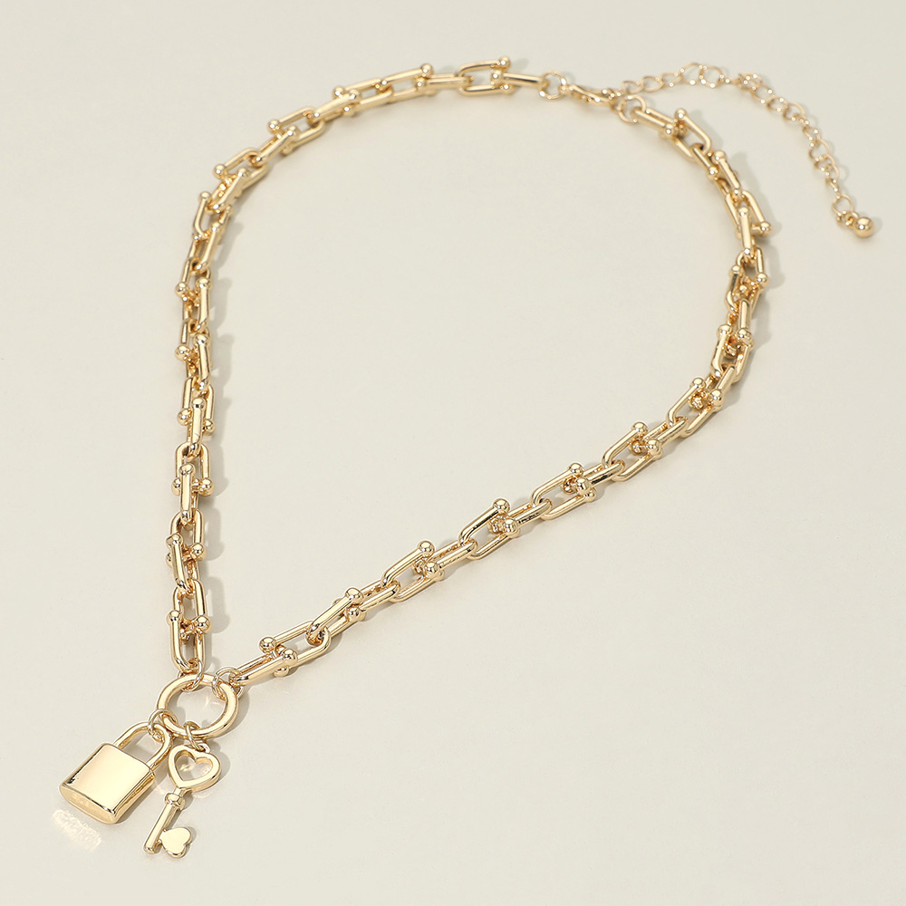 Details • Necklace Size : 16" + 3.25" L • Decor Size : 0.25" L • Pendant Size : 0.75" X 1.4" • This lock and key charm chain necklace features a bold linked design accented with symbolic lock and heart key charms for a modern, meaningful look. Designed for effortless layering or standalone wear, it adds statement appeal to everyday outfits, gift assortments, and boutique jewelry collections. • Lead and Nickel Compliant