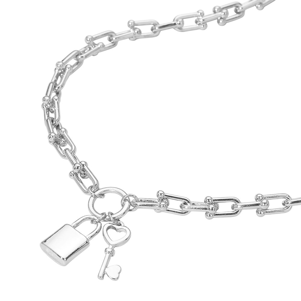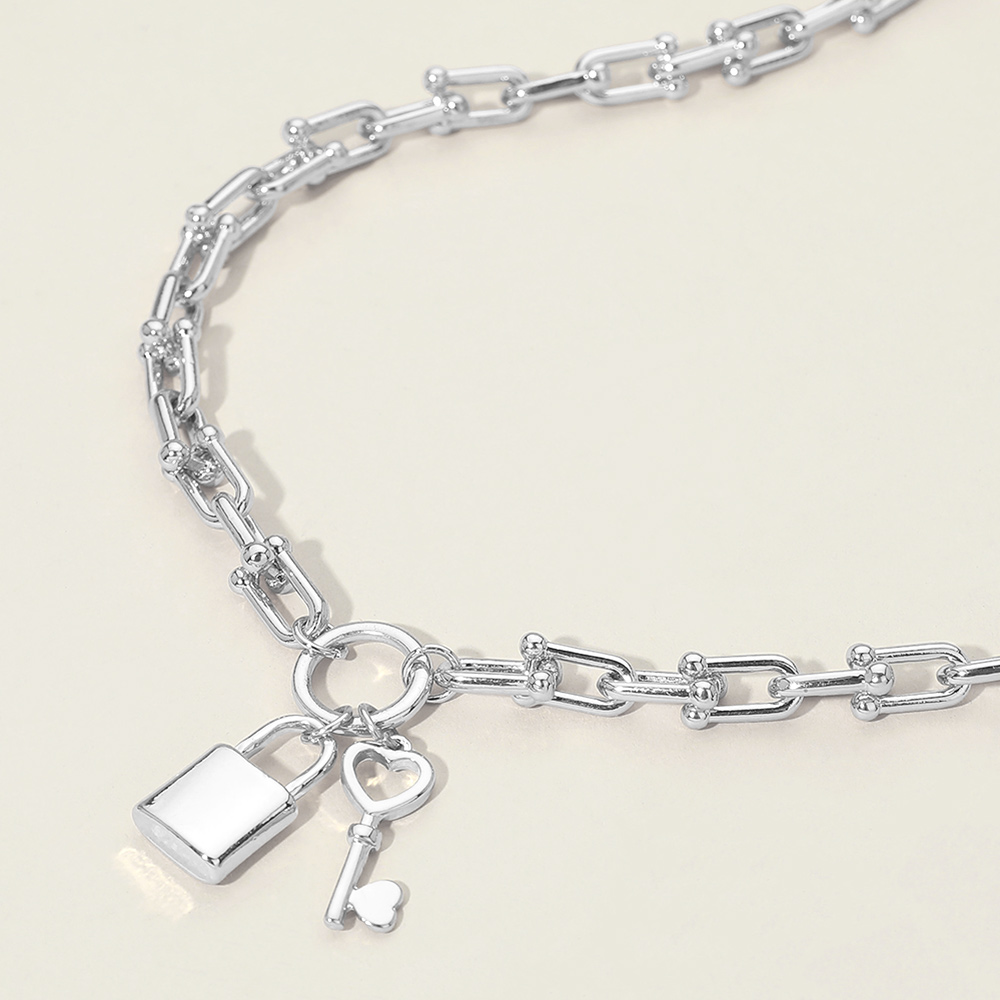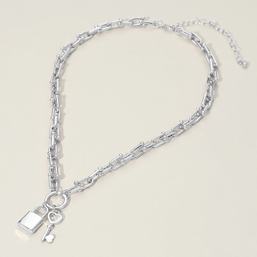 Details • Necklace Size : 16" + 3.25" L • Decor Size : 0.25" L • Pendant Size : 0.75" X 1.4" • This lock and key charm chain necklace features a bold linked design accented with symbolic lock and heart key charms for a modern, meaningful look. Designed for effortless layering or standalone wear, it adds statement appeal to everyday outfits, gift assortments, and boutique jewelry collections. • Lead and Nickel Compliant