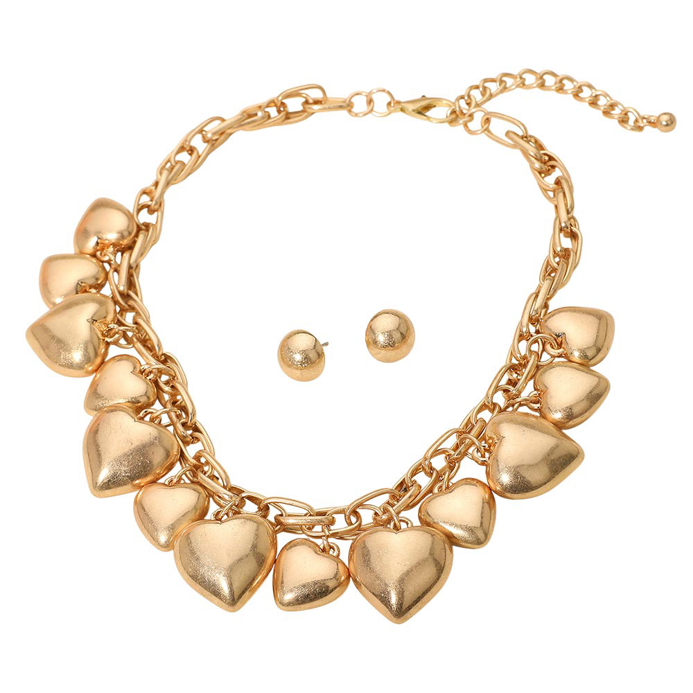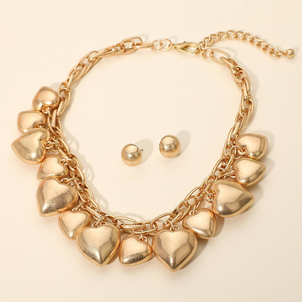 • Bold heart charm chain necklace paired with matching stud earrings for a coordinated look. Features layered links and smooth puffed hearts for a statement finish that elevates casual and dressy outfits alike, adding a romantic and confident touch to any jewelry collection.