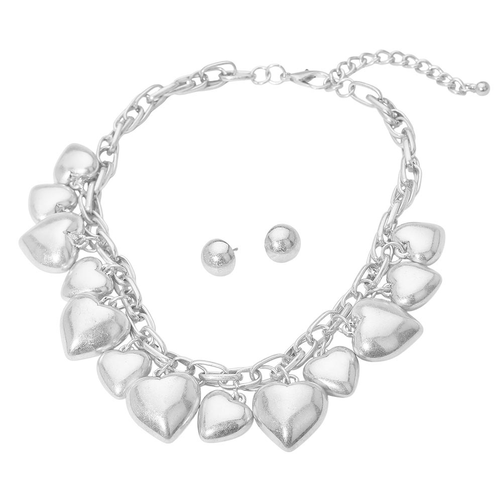 Details • Necklace Size : 16.5" + 3" L • Decor Size : 1.5" L • Earrings Size : 0.5" L • Bold heart charm chain necklace paired with matching stud earrings for a coordinated look. Features layered links and smooth puffed hearts for a statement finish that elevates casual and dressy outfits alike, adding a romantic and confident touch to any jewelry collection. • Lead and Nickel Compliant