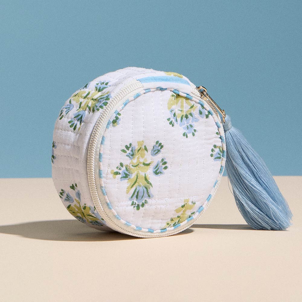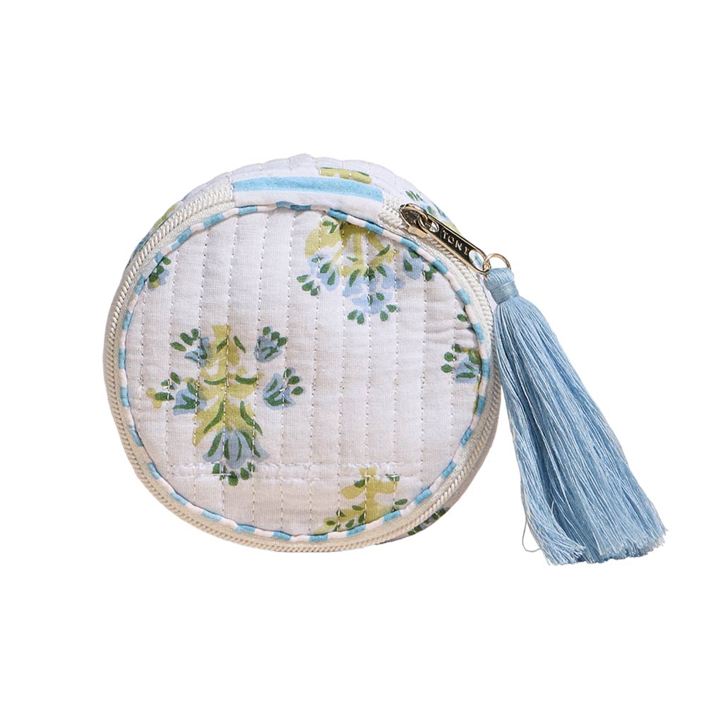 Details • Size : 3.5" X 2" • Zipper Closure • Charming round mini zip pouch designed for organizing coins, jewelry, earbuds, or small daily essentials. The quilted floral design and tassel zipper add a stylish touch while keeping items secure, making it ideal for handbags, travel, gifting, or everyday on-the-go storage.
