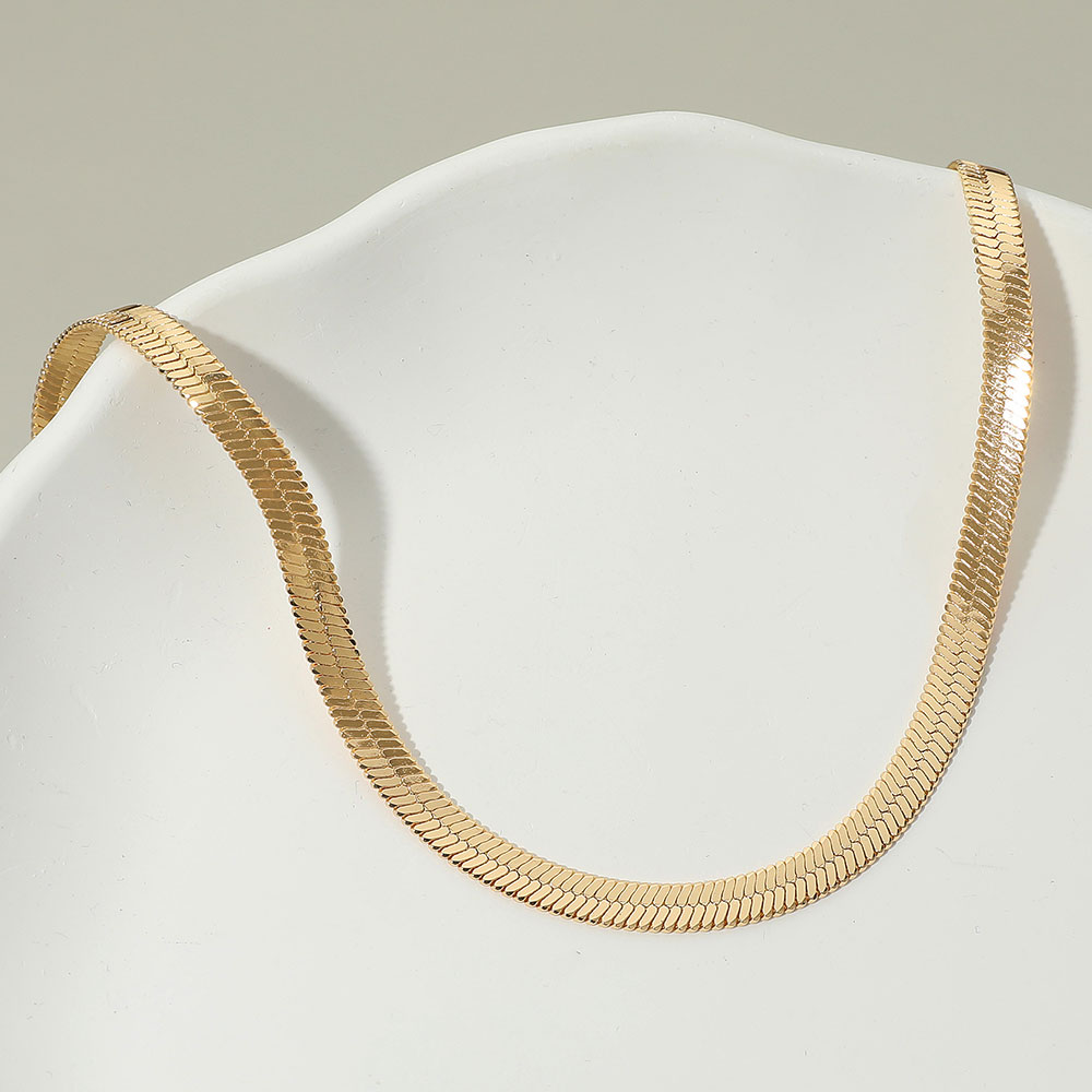 Details • Necklace Size : 19" + 3" L • Decor Size : 0.25" L • Discover effortless sophistication with this herringbone chain necklace, crafted with smooth, flat links that reflect light beautifully. Its sleek and modern design makes it the perfect versatile accessory, ideal for layering or wearing alone to elevate any outfit. • Gold Dipped • Lead and Nickel Compliant