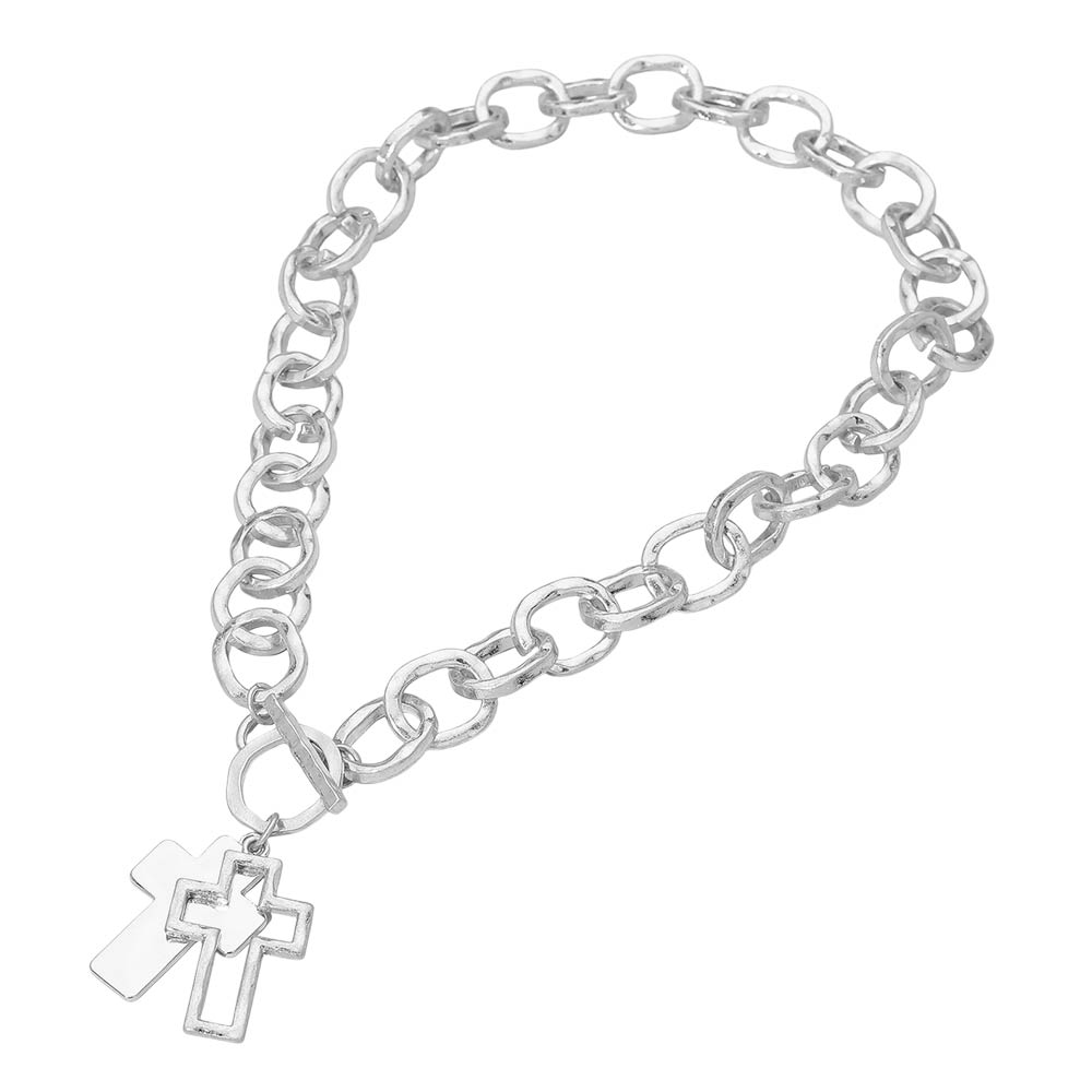 Hammered Layered Cross Pendant Chunky Chain Toggle Necklace Hammered Layered Cross Pendant Chunky Chain Toggle Necklace