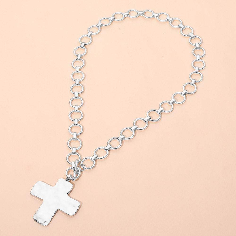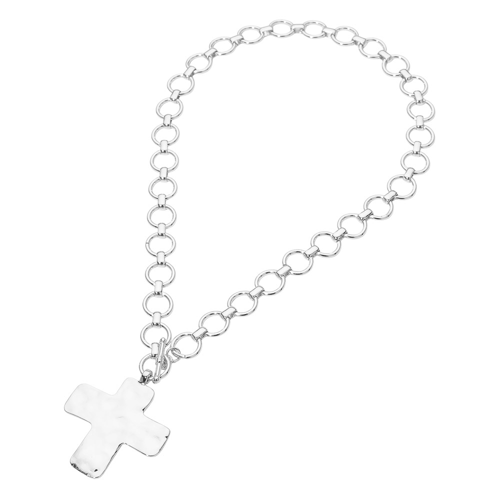 Hammered Matte Metal Cross Pendant Chunky Chain Toggle Necklace