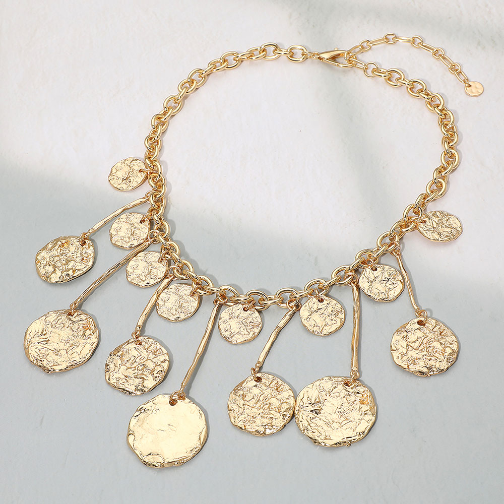 Details • Necklace Size : 17" + 3" L • Decor Size : 3.5" L • Elevate your look with this mixed coin dangle statement necklace featuring textured charms that sway gracefully with every movement. Its bold, eye-catching design brings artistic flair to any outfit, making it an ideal accessory for adding standout style to both casual and dressy ensembles. • Lead and Nickel Compliant