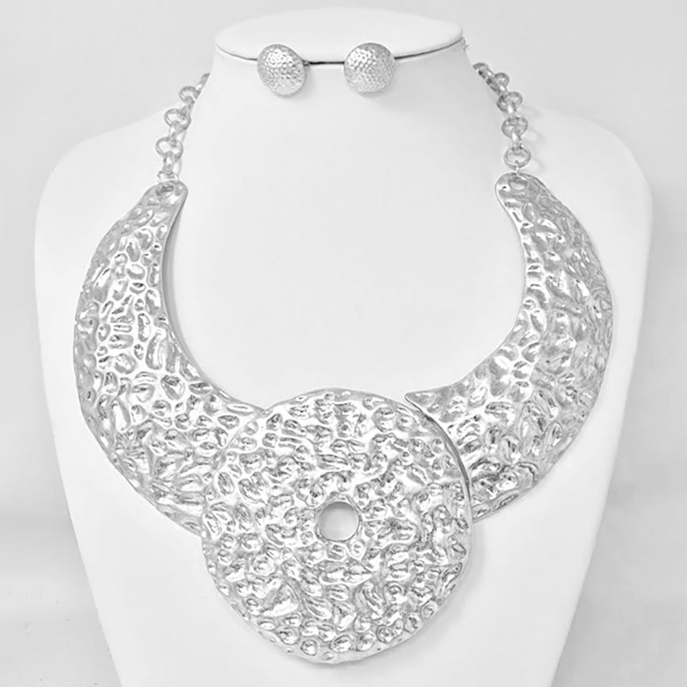 Details • Necklace Size : 19" + 3" L • Decor Size : 3.5" L • Earrings Size : 0.7" L • Elevate your look with this hammered statement collar necklace and matching earrings. Featuring bold, sculpted textures and a striking circular centerpiece, this set exudes modern elegance—perfect for adding a touch of artistic sophistication to any outfit. • Lead and Nickel Compliant