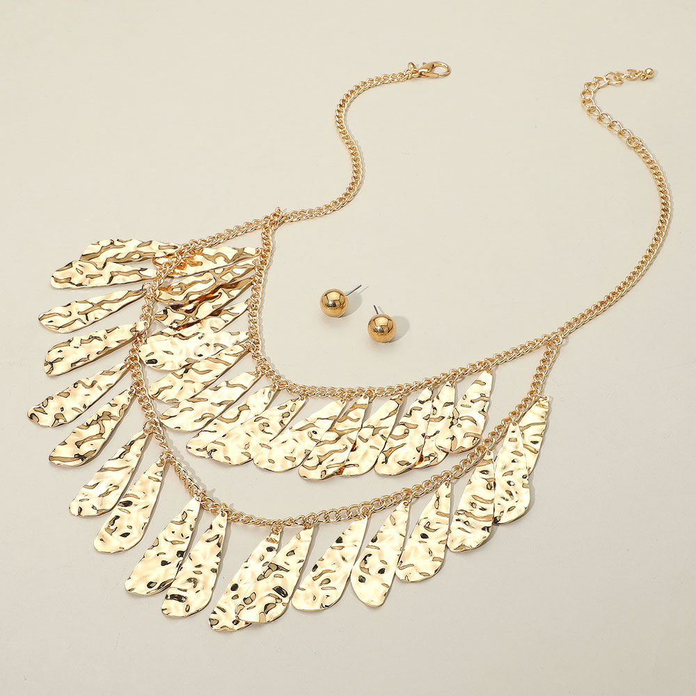 Details • Necklace Size : 21.5" + 3.5" L • Decor Size : 5" L • Earrings Size : 0.4" L • Bold layered necklace set featuring hammered fan-shaped accents that create a dramatic cascading effect. Paired with simple stud earrings, this set adds artistic flair to evening looks, special events or fashion-forward outfits with its striking, sculptural design. • Lead and Nickel Compliant