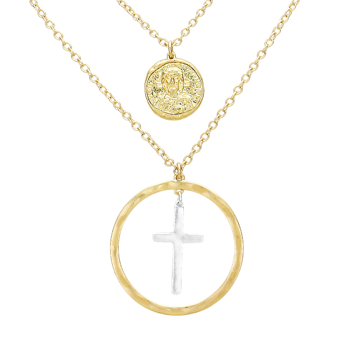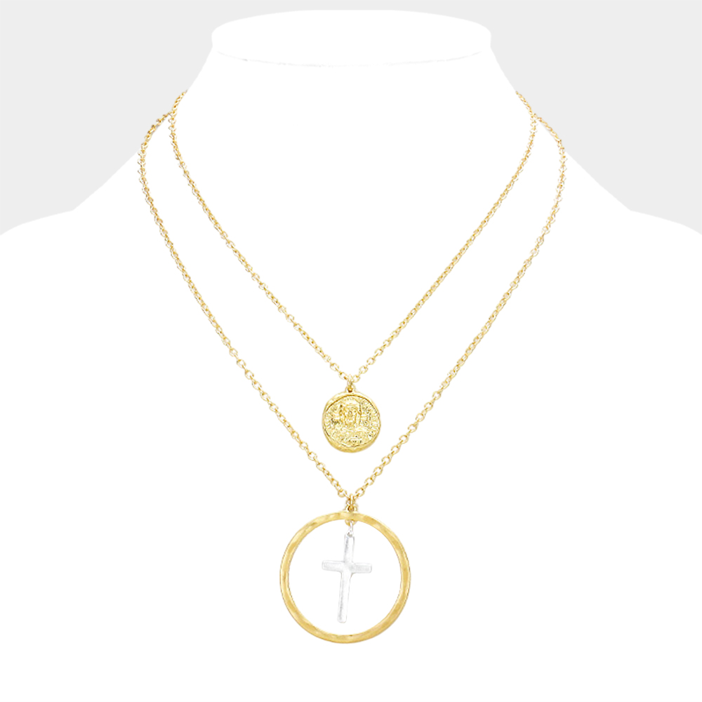 Double Layered Metal Cross Jesus Disc Drop Chain Tassel Necklace