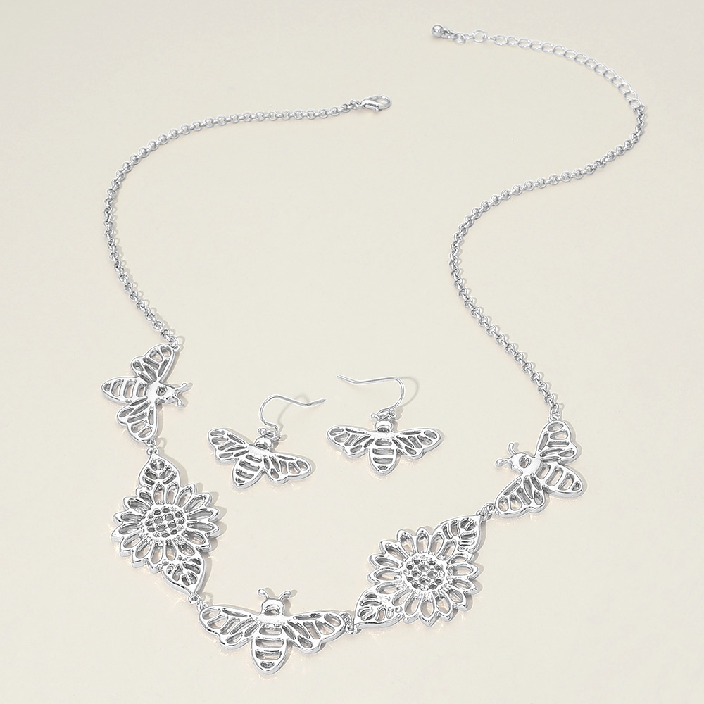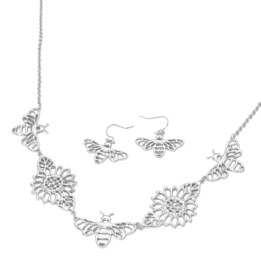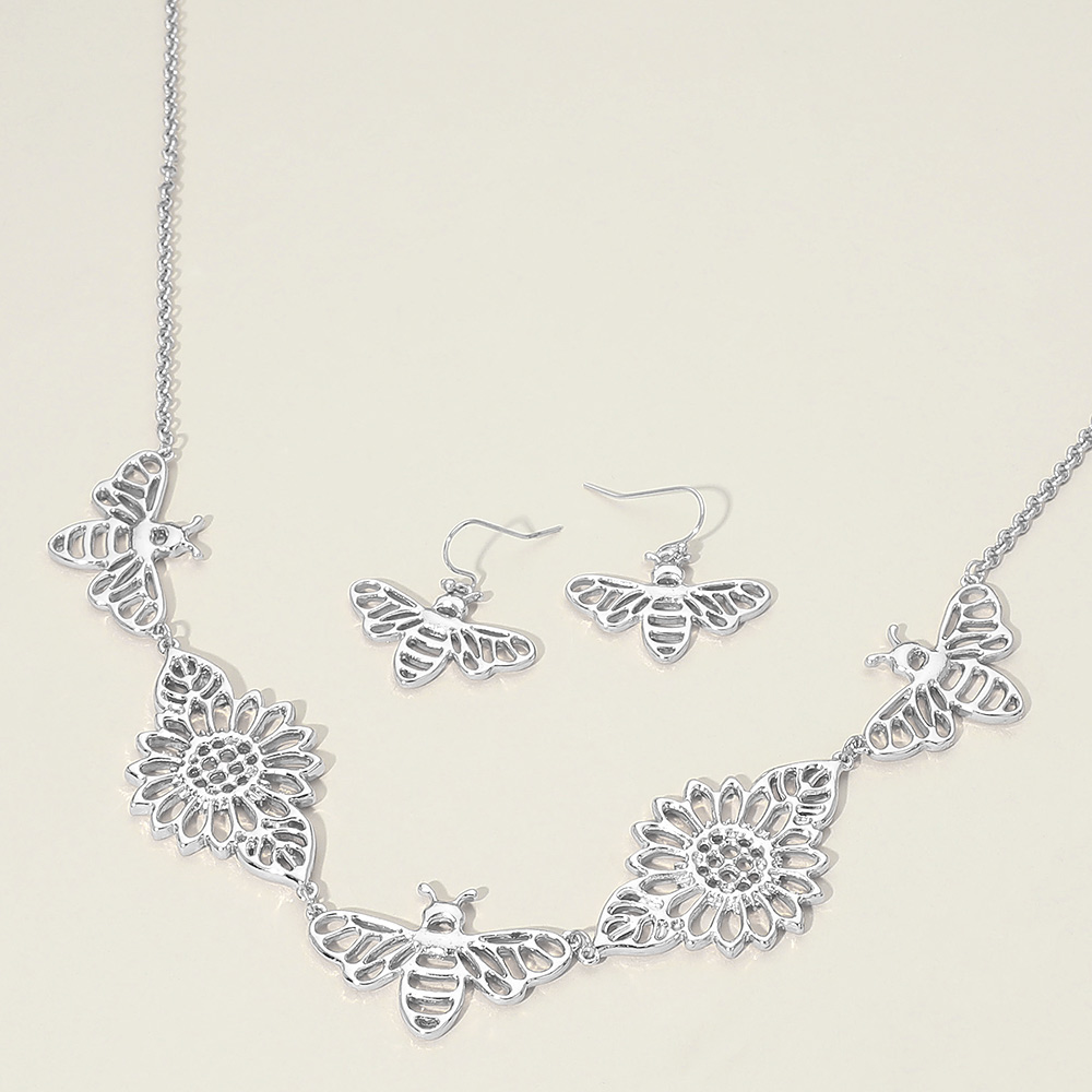 • This bumble bee and floral necklace and earring set showcases openwork butterfly accents paired with detailed flower motifs for a graceful, nature-inspired design. Easy to style together or separately, it suits everyday wear, gifting, boutiques, and seasonal collections, offering a delicate statement with versatile appeal.