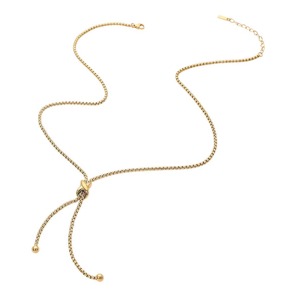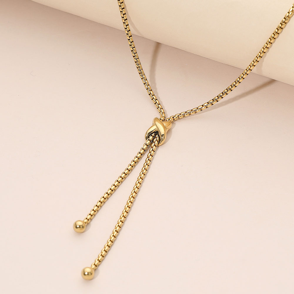 Details • Necklace Size : 20" + 2.5" L • Decor Size : 3" L • Sleek sliding-knot necklace with a fluid Y-style drop that creates a modern, elongated silhouette. Designed for adjustable wear and versatile styling from casual looks to evening outfits, perfect as a solo statement or layered for added dimension. • Hypoallergenic • Stainless Steel