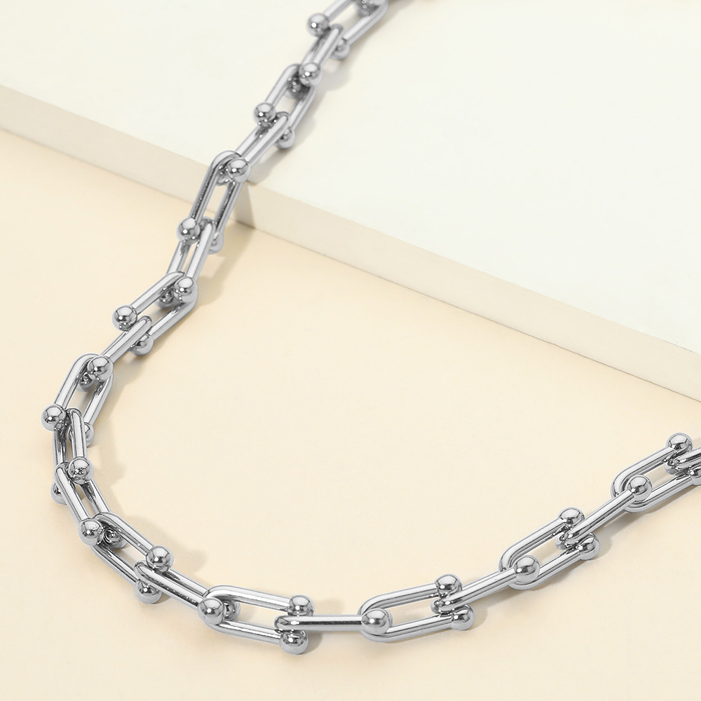 • This modern stainless steel industrial link chain necklace features a sleek, structured design that adds a bold yet versatile accent to any outfit. Its clean silhouette makes it ideal for everyday wear, layering, or statement styling. A strong choice for trend-driven collections, this necklace appeals to customers seeking contemporary accessories with effortless styling potential.