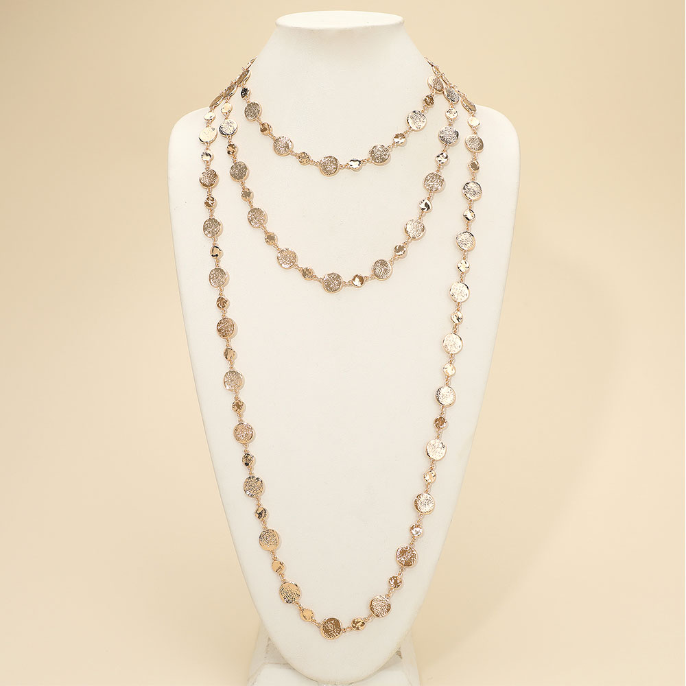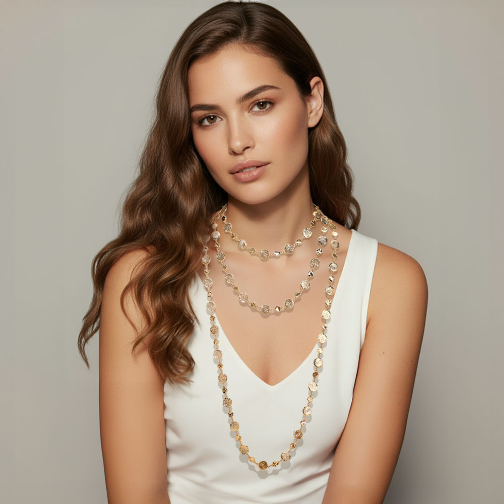 Details • Necklace Size : 17" + 3.25" L • Decor Size : 1.2" L • Elevate your style with this elegant multi-layer coin charm necklace, designed to add depth and refined movement to any look. Its delicate, cascading layers create a polished statement that complements both casual and sophisticated ensembles with effortless versatility. • Lead and Nickel Compliant