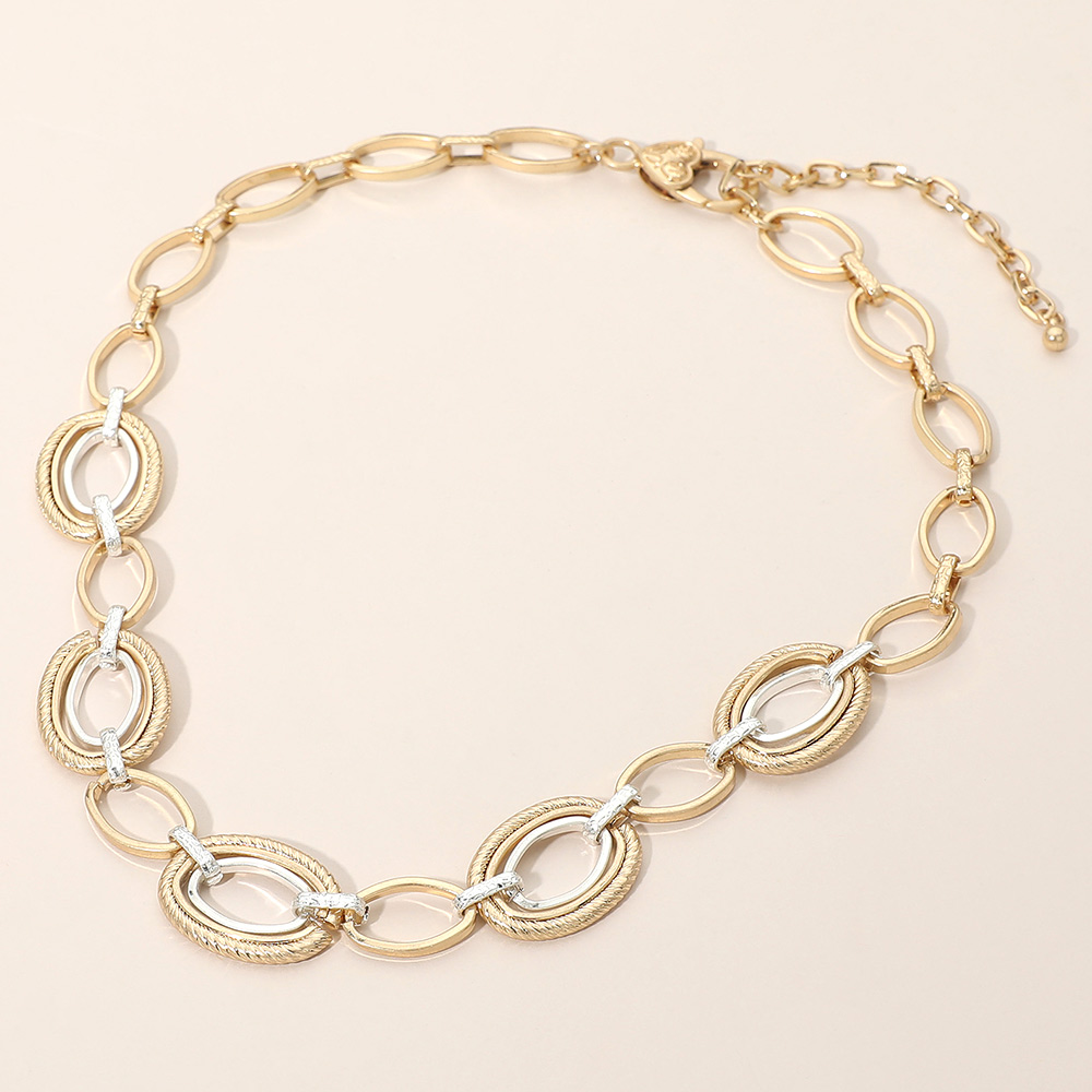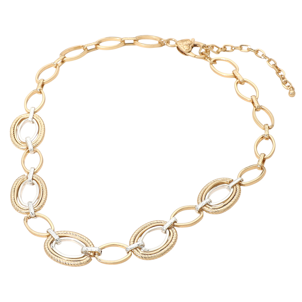 Details • Necklace Size : 17.5" + 3.25" L • Decor Size : 0.75" L • This interlinked oval chain necklace features alternating smooth and textured links that create visual depth and elegant movement on the wrist. Designed for comfortable all-day wear, it offers a refined statement that pairs effortlessly with both casual looks and elevated outfits. An adjustable extender ensures a flexible fit, making it ideal for layering or wearing solo as a polished everyday accessory. • Lead and Nickel Compliant