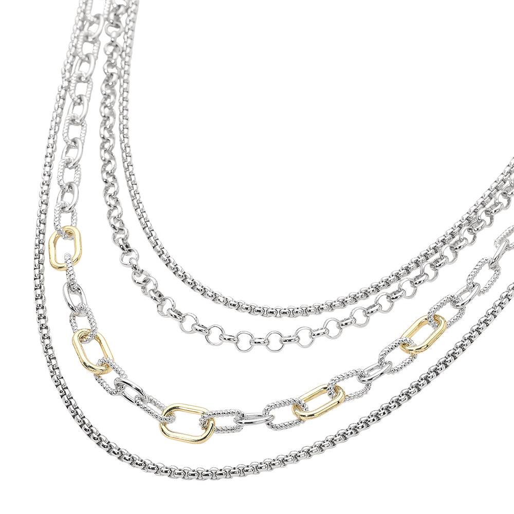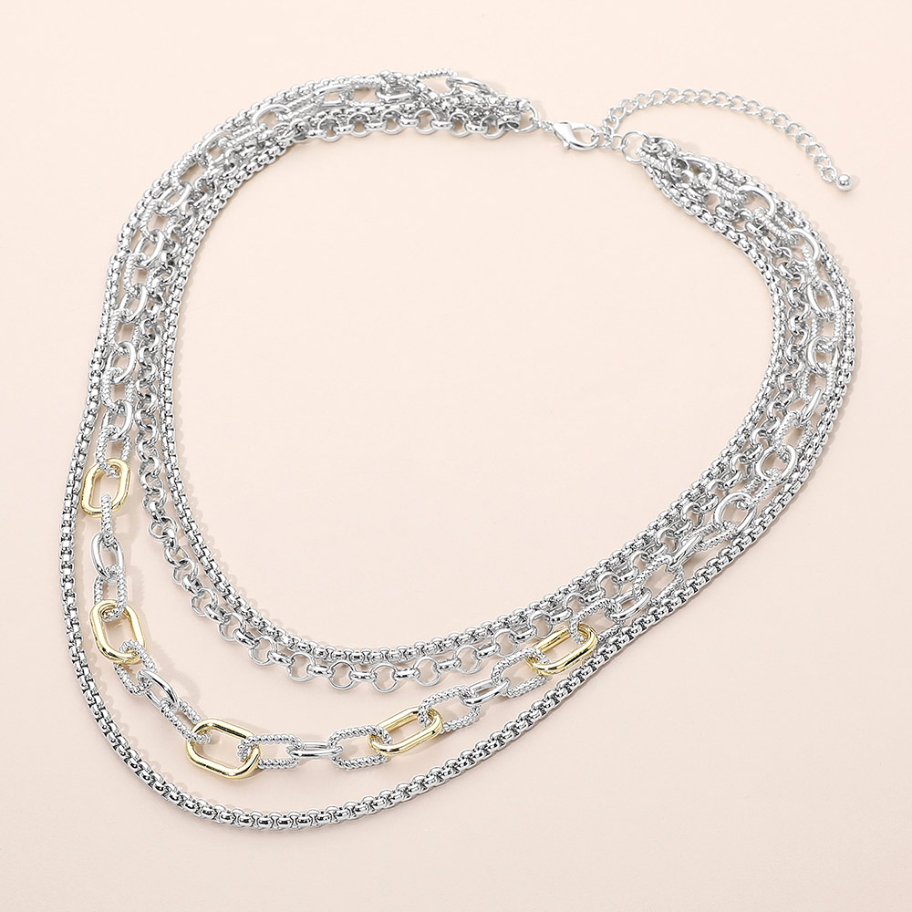 Details • Necklace Size : 18.5" + 3.25" L • Decor Size : 3.25" L • Stylish layered necklace featuring a mix of bold and delicate links that create a dynamic, modern look. Its multi-strand design adds depth and versatility, making it an eye-catching accessory perfect for enhancing everyday outfits or elevating evening ensembles. • Lead and Nickel Compliant