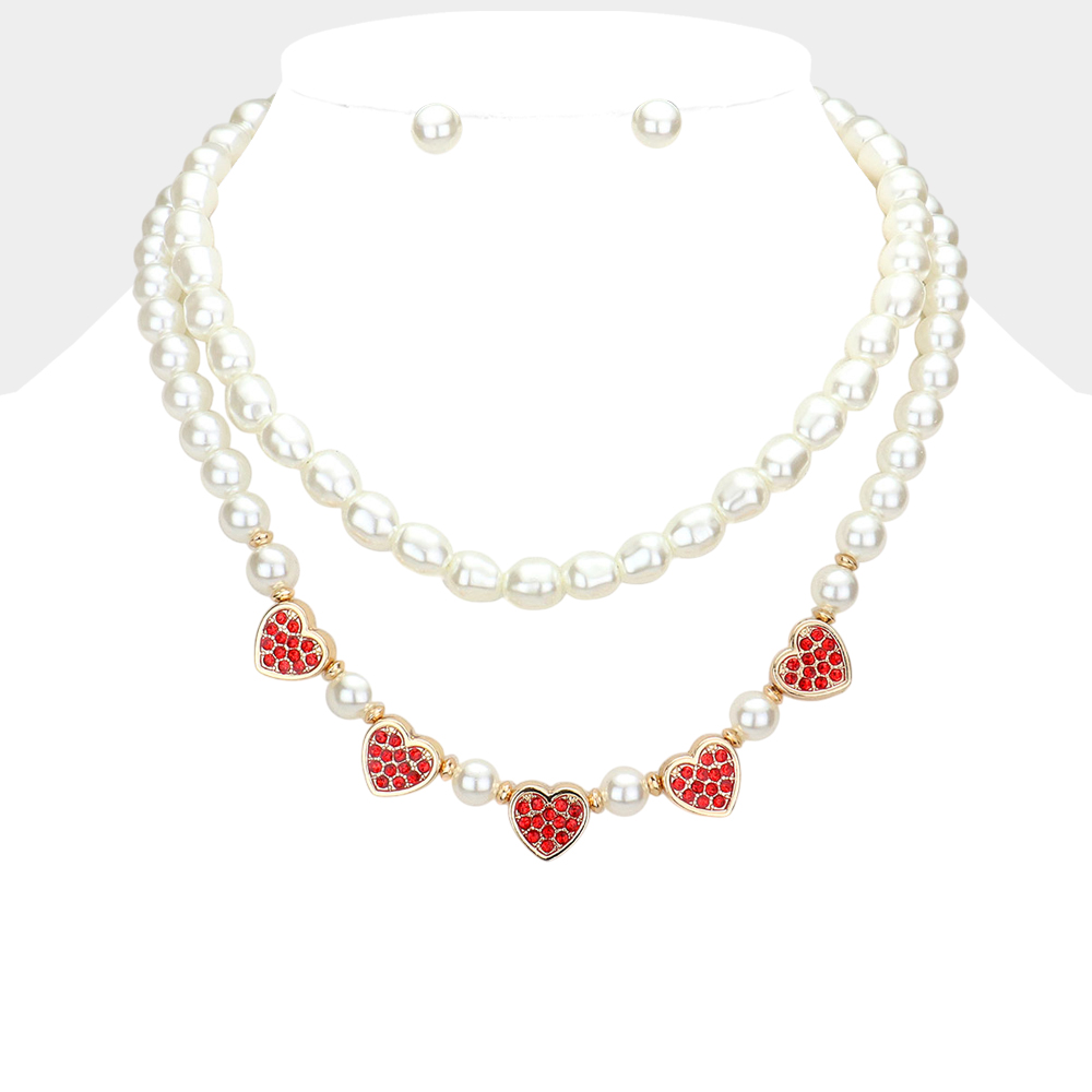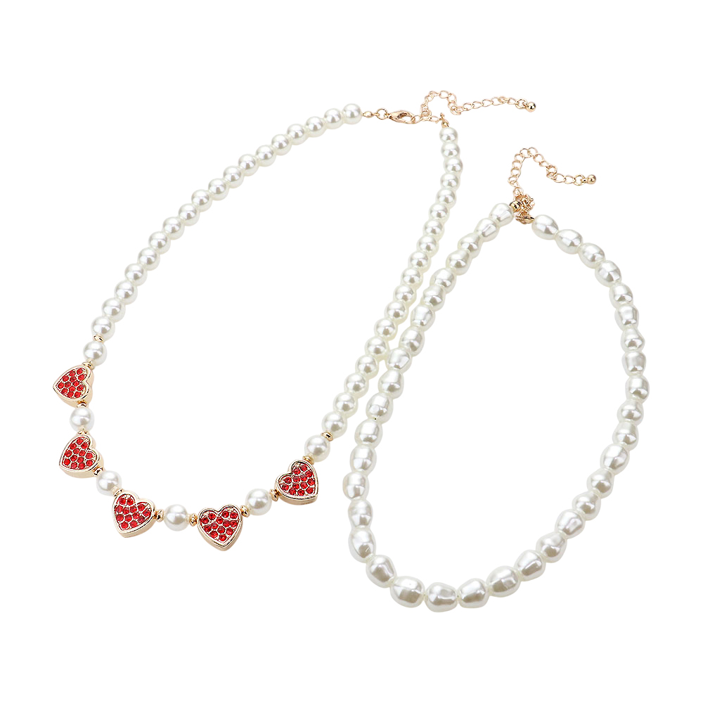 2PCS - Rhinestone Embellished Metal Heart Accented Pearl Necklaces