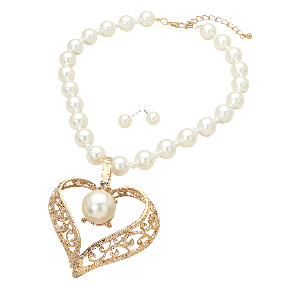 • This pearl necklace set features a classic beaded design highlighted by a heart shaped pendant centerpiece and coordinating stud earrings. Designed for weddings, special occasions, and elegant everyday styling, it adds timeless charm and graceful detail. A versatile jewelry set ideal for boutiques, gifting, and refined accessory collections seeking romantic appeal and polished presentation.