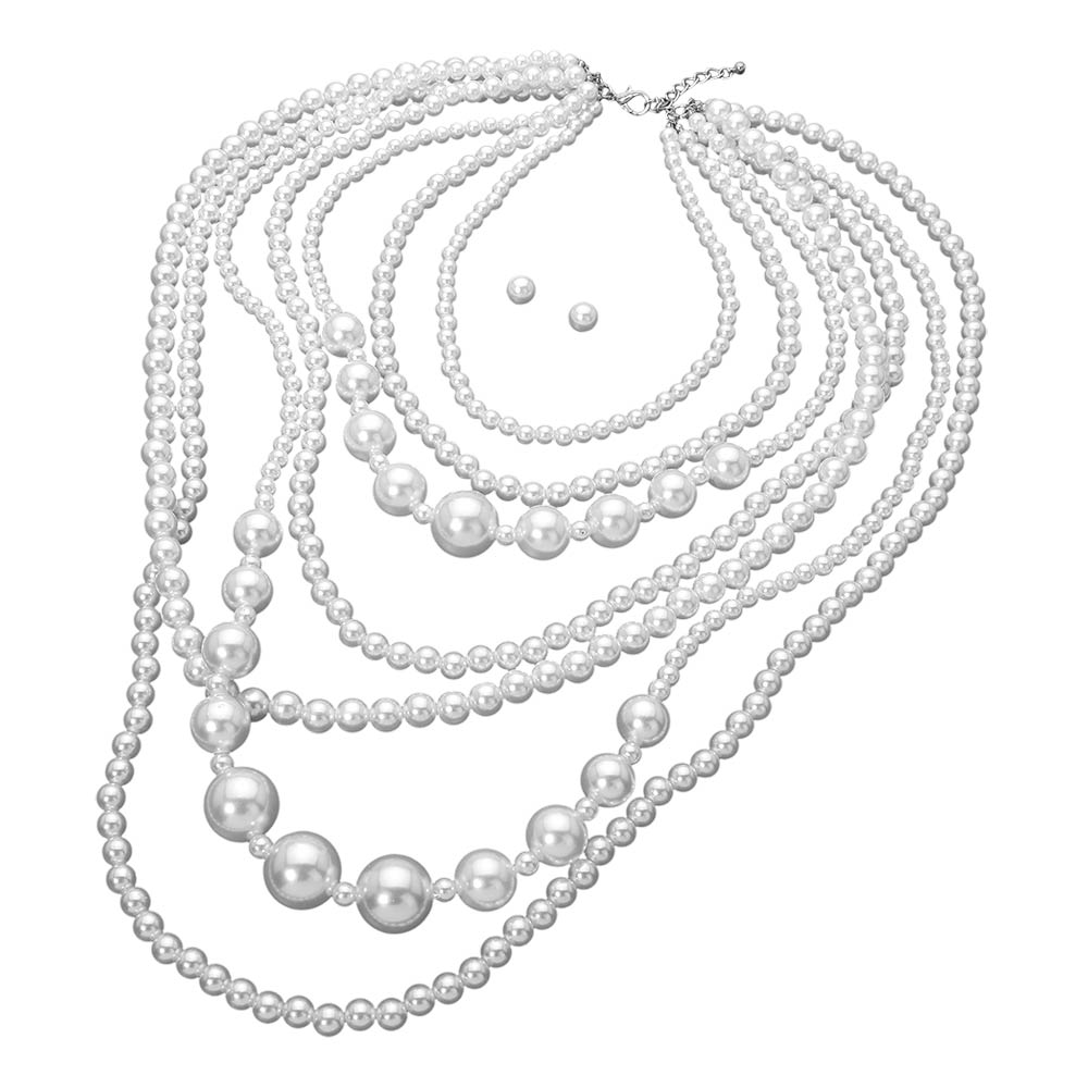 • Elegant layered necklace set designed with multiple pearl strands and graduated bead accents for depth and movement. Drapes beautifully to create a timeless statement look and includes matching stud earrings for effortless coordination. Ideal for formal occasions, bridal styling, or boutiques seeking classic, sophisticated jewelry sets.