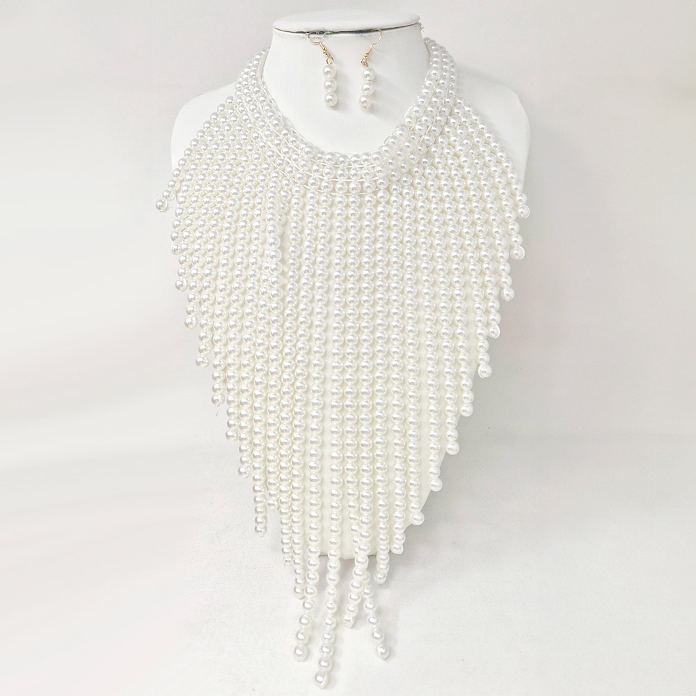 Details • Necklace Size : 15.5" + 3" L • Decor Size : 12" L • Earrings Size : 1.75" L • This layered pearl-inspired necklace set showcases cascading strands that create a dramatic fringe effect for a show-stopping look. Paired with matching dangling earrings, it’s perfect for glamorous occasions, formal events, or adding elegance to evening wear. • Lead and Nickel Compliant