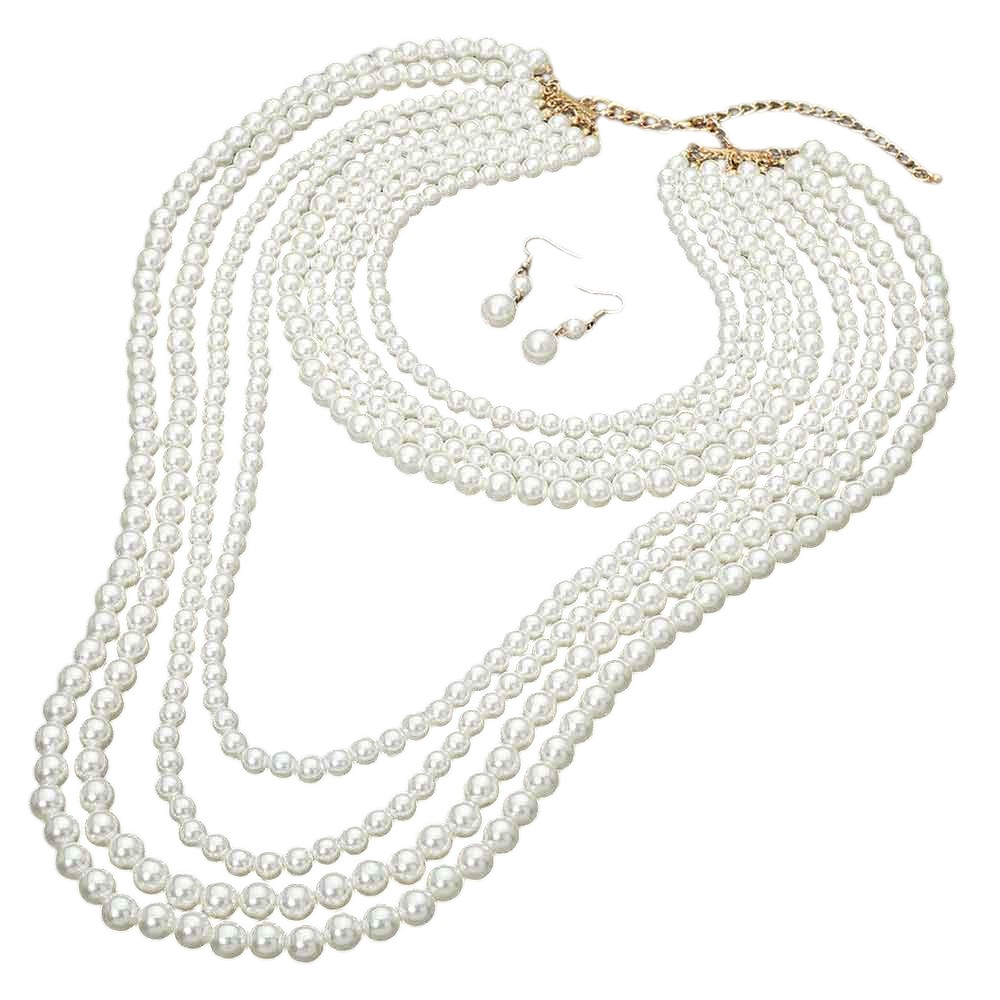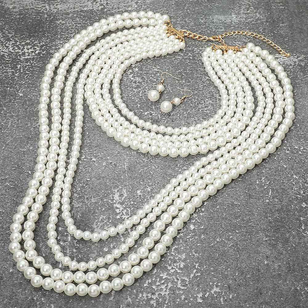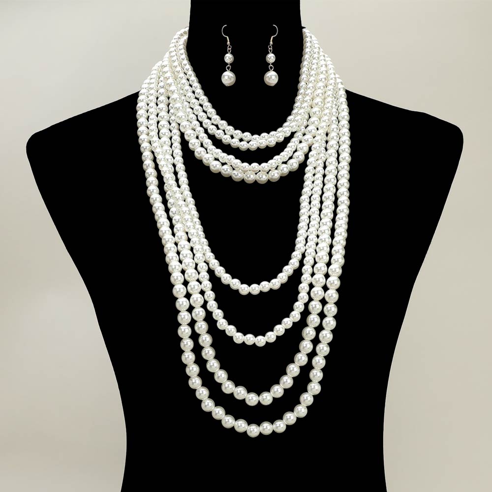 Details • Necklace Size : 18" + 5.25" L • Decor Size : 10.5" L • Earring Size : 1.8" L • Timeless layered pearl necklace set designed with multiple strands for elegant depth and movement. Drapes beautifully to elevate both formal and everyday looks and includes matching drop earrings for coordinated styling. Ideal for special occasions, bridal wear, or boutiques seeking classic, refined jewelry sets. • Lead and Nickel Compliant