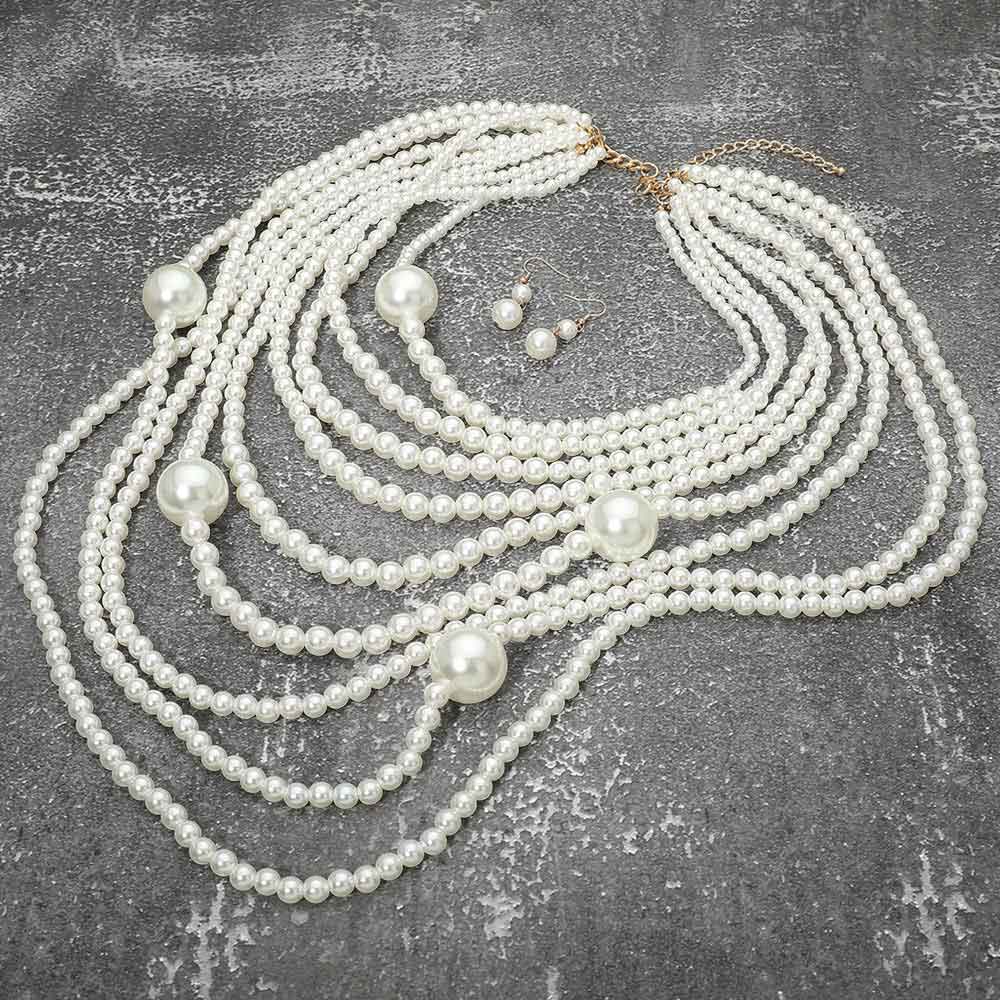 • Elegant multi strand pearl necklace set designed with layered draping and statement bead accents for added dimension and movement. Creates a bold yet timeless look and includes matching drop earrings for coordinated styling. Ideal for formal events, bridal wear, or boutiques seeking classic, elevated jewelry sets.