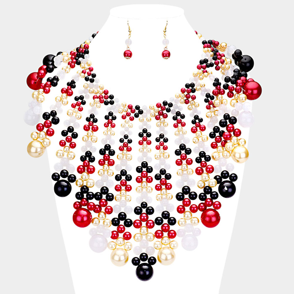 Tweed Fabric Ball Pearl Triple Layered Bib Necklace