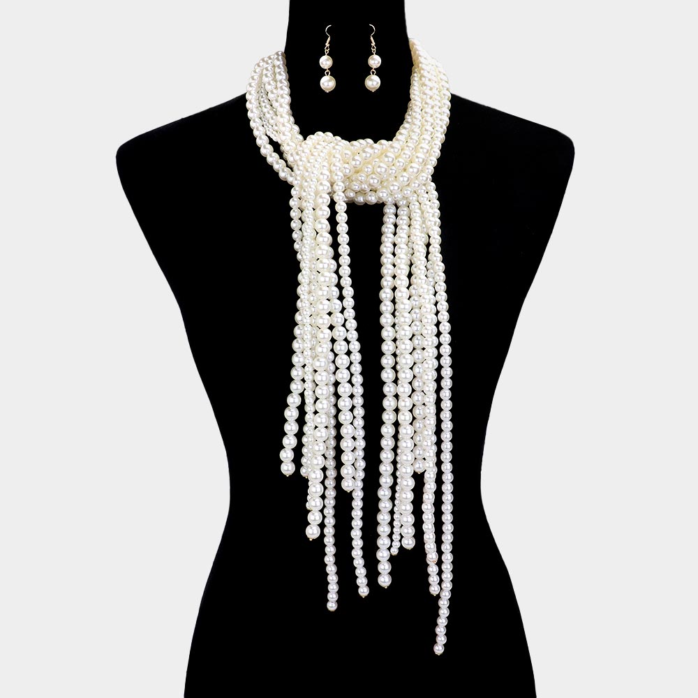 • Elegant multi strand pearl scarf-style necklace designed to drape beautifully with fluid movement and timeless appeal. Features layered strands for a statement look and includes matching drop earrings for coordinated styling. Perfect for formal events, special occasions, or boutiques seeking classic, sophisticated jewelry sets.
