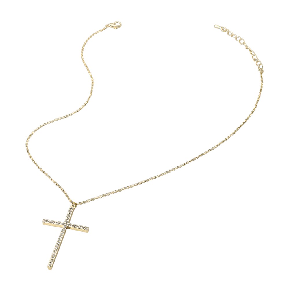 Details • Necklace Size : 16" + 2" L • Pendant Size : 1.2" X 2" • Elegant cross pendant necklace designed with shimmering accents on a delicate chain. A timeless piece that adds meaning and sophistication, perfect for layering or wearing alone for both casual and formal occasions. • CZ Cubic Zirconia • Gold Dipped