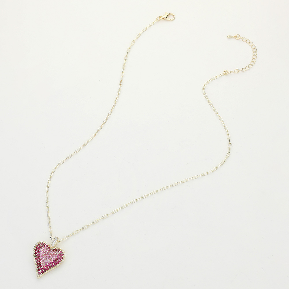 14K Gold Plated CZ Stone Paved Heart Paperclip Chain Pendant Necklace