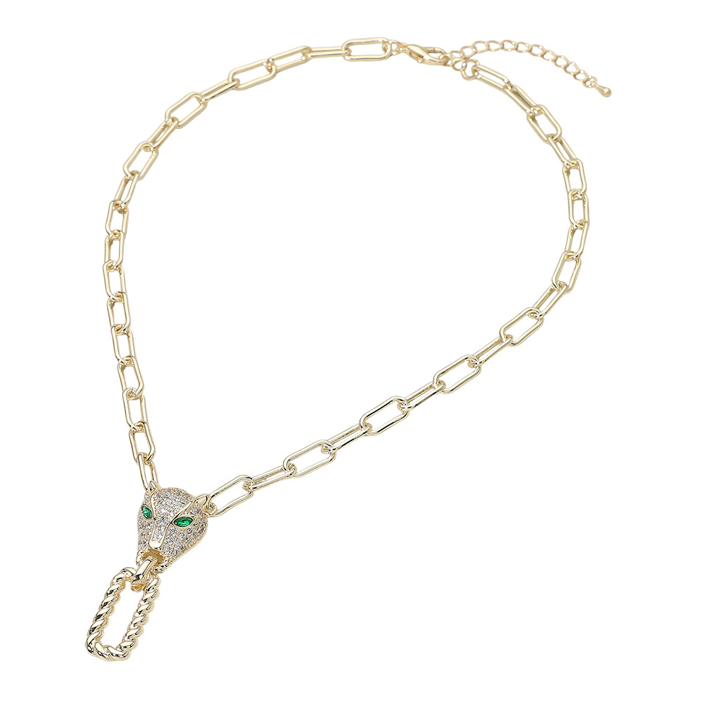 Details • Necklace Size : 17.5" + 2" L • Pendant Size : 0.75" X 2" • Statement chain necklace featuring a bold leopard head pendant with sparkling cz accents and a textured link drop charm. Designed with elongated links for a modern, eye-catching look, this piece adds a striking touch to any outfit and makes a standout accessory for day or night. • Gold Dipped • CZ Cubic Zirconia
