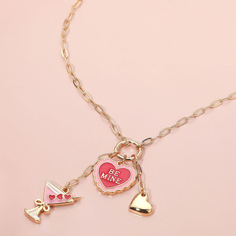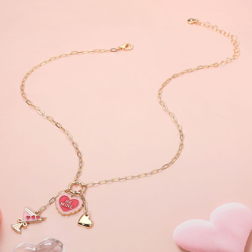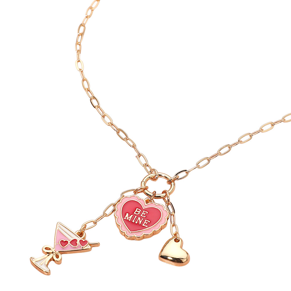 Details • Necklace Size : 16" + 3.5" L • Pendant Size : 0.8" X 2.1" • Show your playful side with this “Be Mine” charm necklace, featuring a sweet heart pendant, a tiny heart accent, and a cocktail glass charm. Its dainty chain and whimsical details create a romantic yet fun statement, making it a perfect gift or stylish accessory for any occasion. • Lead and Nickel Compliant
