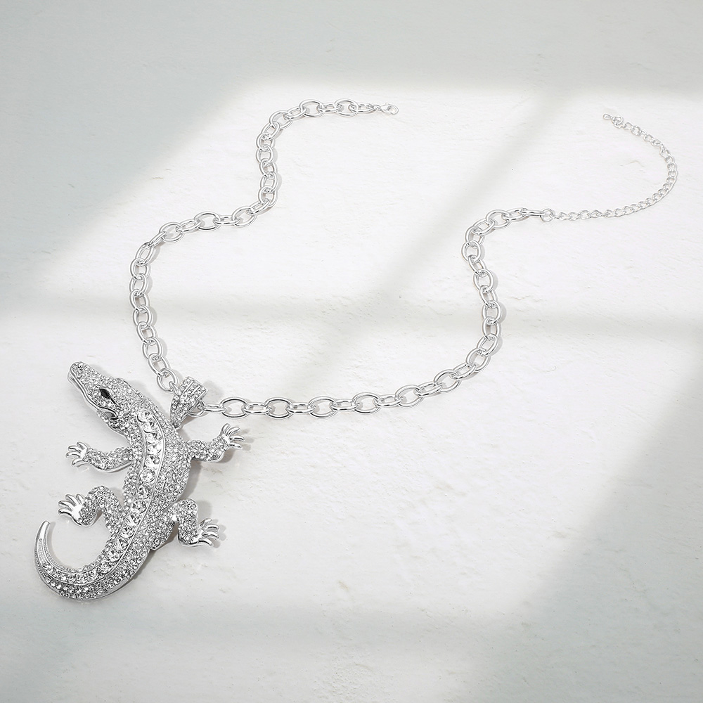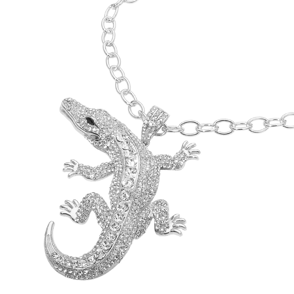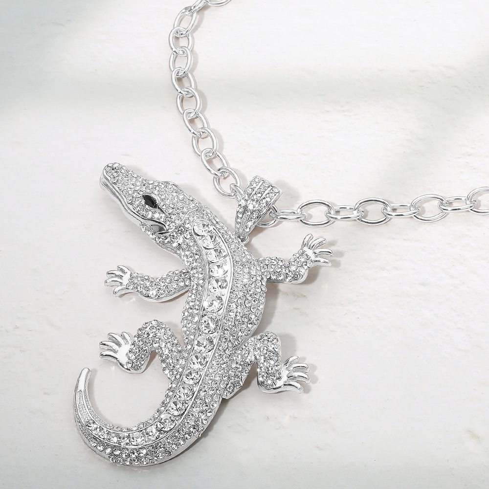 Details • Necklace Size : 22.5" + 5.5" L • Pendant Size : 3.25" X 4.25" • Bold alligator pendant necklace with shimmering accents on a chunky chain. This statement jewelry piece combines edgy charm with artistic flair, perfect for fashion-forward looks or themed events, adding a fierce and captivating touch to any stylish outfit. • Lead and Nickel Compliant