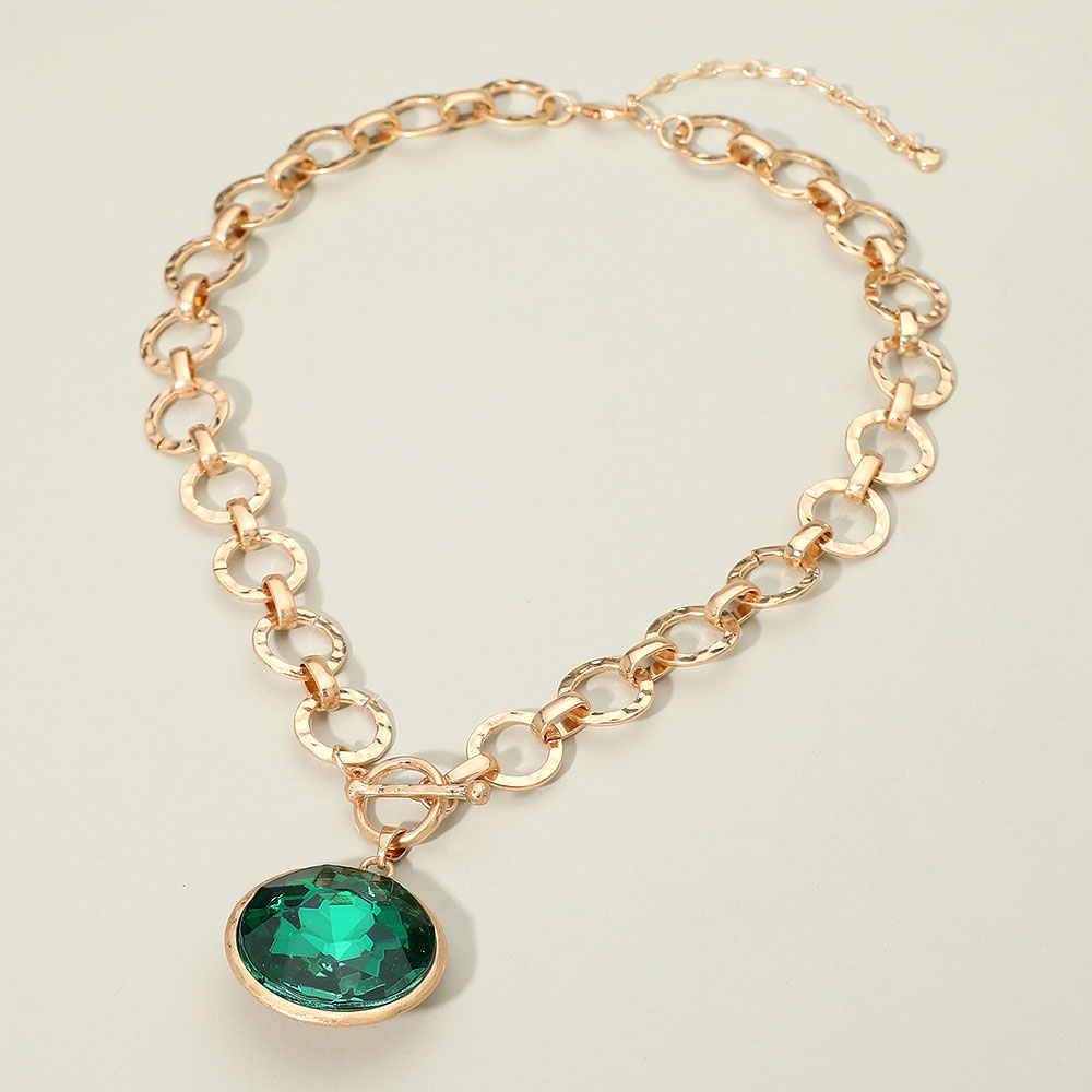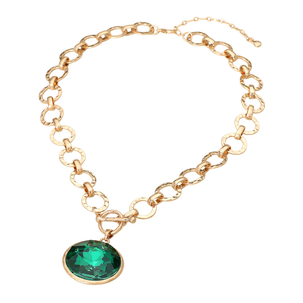 Details • Necklace Size : 18" + 3" L • Pendant Size : 1.4" X 1.4" • Toggle Closure • Add a touch of elegance to your style with this hammered link chain necklace featuring a stunning faceted gem pendant. Designed for both sophistication and edge, this piece is ideal for evening wear or everyday glamour, making it a standout addition to any jewelry collection. • Lead and Nickel Compliant