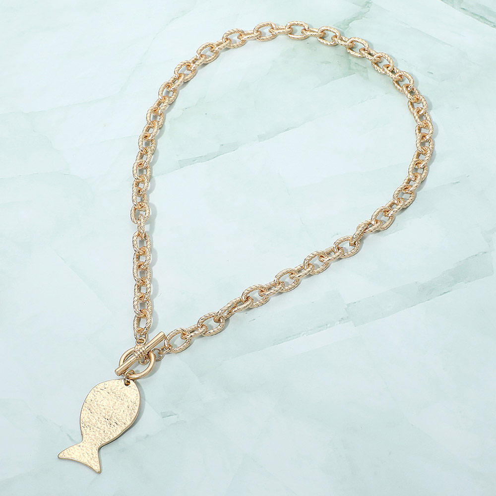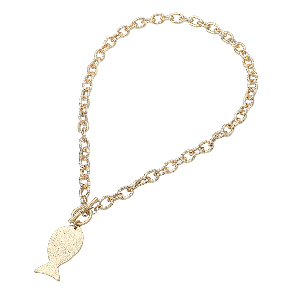• Statement necklace featuring a textured link chain with a playful fish charm accent. Designed for effortless styling, this piece works beautifully worn solo or layered with other favorites. A versatile accessory that adds character, charm, and boutique appeal to everyday outfits and seasonal collections.