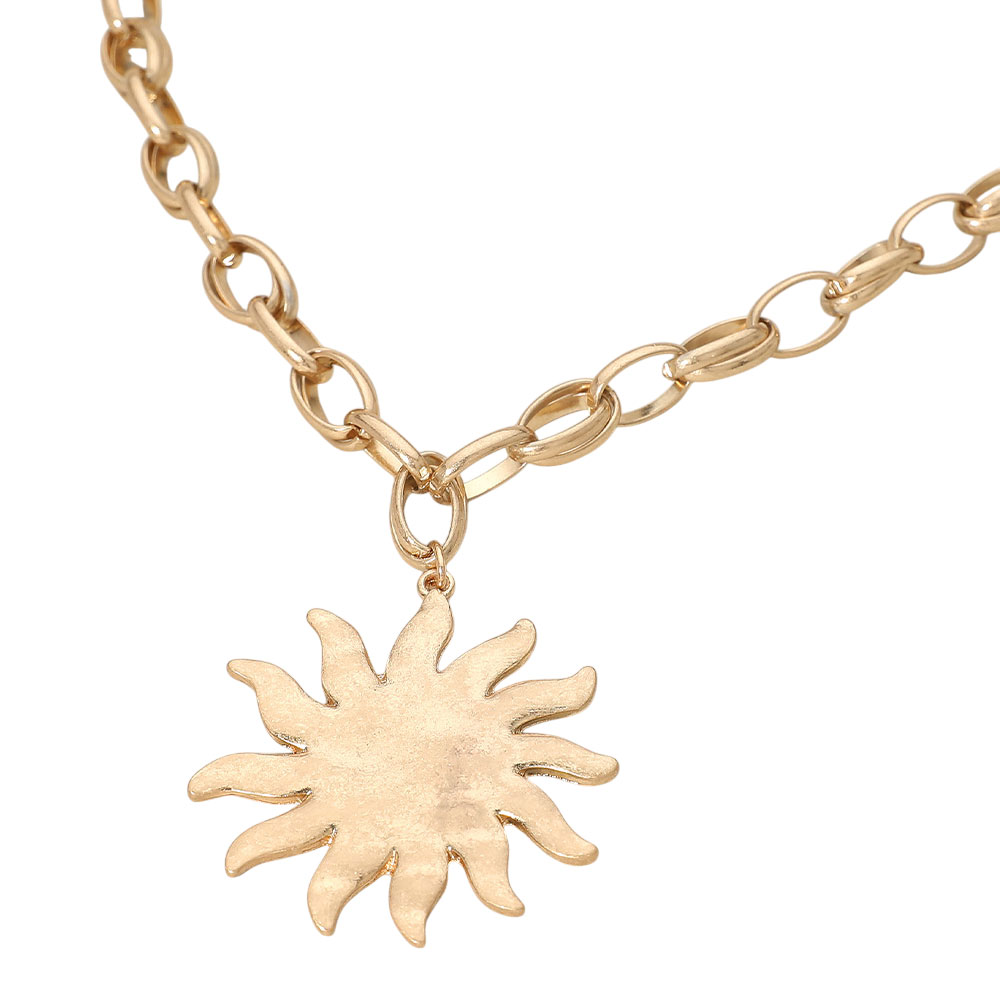 Details • Necklace Size : 17" + 3.5" L • Pendant Size : 1.75" X 2" • Brighten your everyday style with the Sunburst Charm Chain Necklace, featuring a radiant sun-inspired charm suspended from a timeless link chain. Perfect worn alone or layered, this versatile piece adds a bold yet effortless statement to any outfit. • Lead and Nickel Compliant