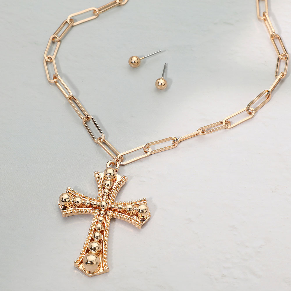 Details • Necklace Size : 17.5" + 2.25" L • Pendant Size : 1.5" X 2.25" • Earrings Size : 0.2" L • Elegant cross pendant necklace set featuring a bold link chain and matching stud earrings. The detailed cross design adds a touch of modern sophistication, perfect for layering or statement wear, making it an ideal accessory for everyday elegance or special occasions. • Lead and Nickel Compliant