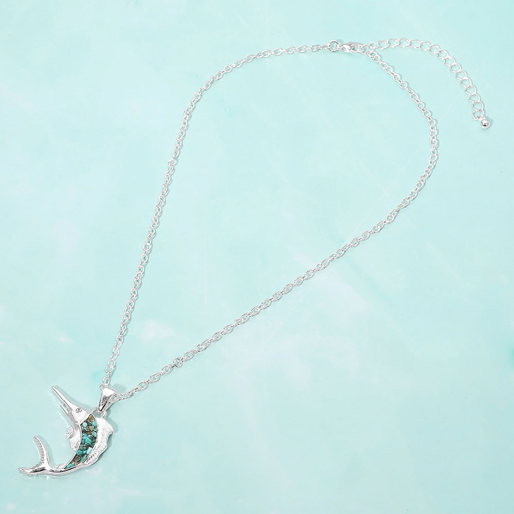 Details • Necklace Size : 18" + 3.5" L • Pendant Size : 1.4" X 1.8" • Swordfish pendant necklace featuring a dynamic ocean-inspired silhouette with textured inlay detail. Designed to stand out in summer and coastal collections, this eye-catching piece is ideal for beach boutiques, resort shops, and gift assortments, adding bold nautical character and strong visual appeal to seasonal jewelry displays. • Lead and Nickel Compliant