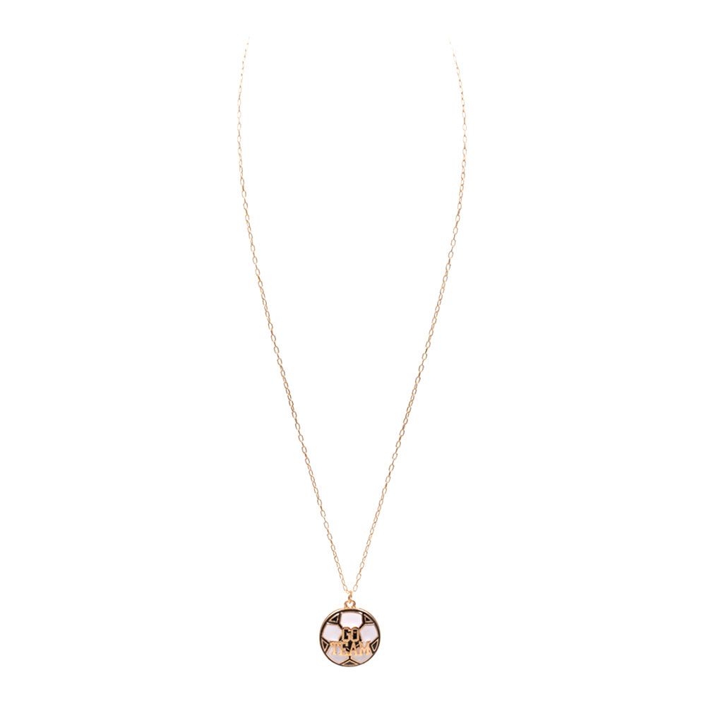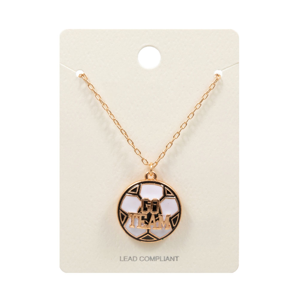Details • Necklace Size : 16.5" + 3.25" L • Pendant Size : 0.8" X 0.9" • Round soccer-inspired pendant necklace featuring a bold “Go Team” message designed for fans and spirited everyday wear. A strong choice for game day outfits, school spirit displays, and sporty gift assortments that pair easily with casual and team-focused looks. • Lead and Nickel Compliant