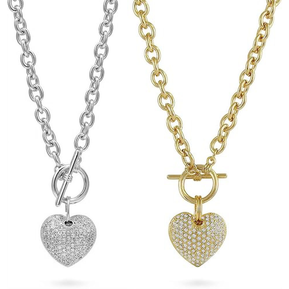 White Gold Dipped CZ Pave Heart Pendant Toggle Necklace