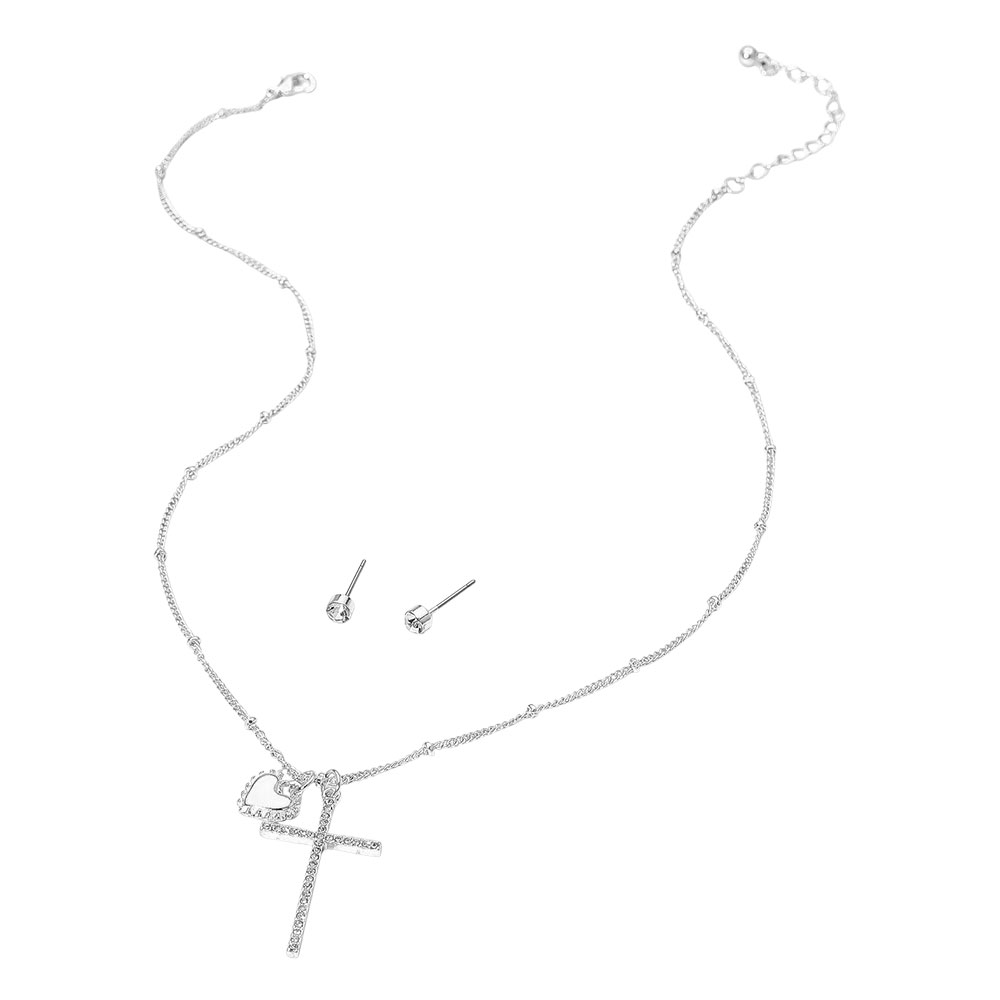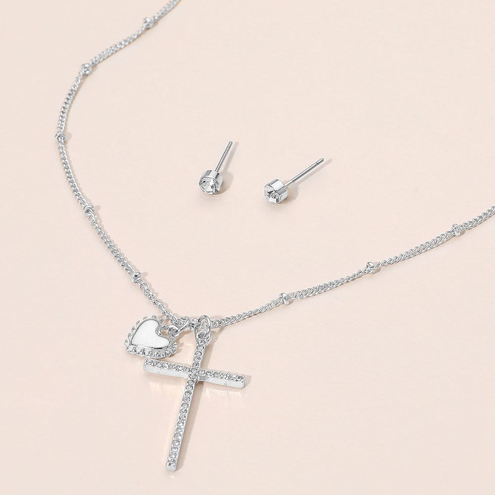 Details • Necklace Size : 16" + 2" L • Pendant Size : 0.75" X 1.25" • Earrings Size : 0.2" L • Add meaningful elegance to your look with this delicate pendant necklace featuring a heart and cross charm, paired with classic stud earrings. Perfect for everyday wear or special moments, this set brings a subtle shine and thoughtful style to any outfit. • Lead and Nickel Compliant